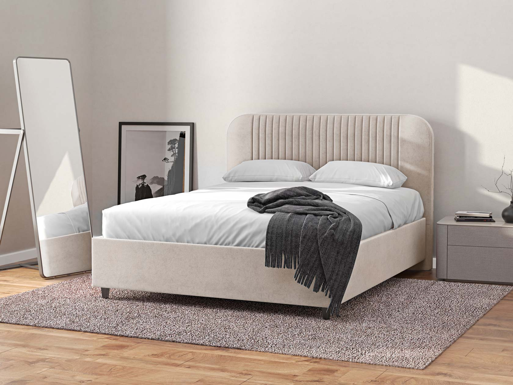 Несмотря на довольно массивное изголовье и высокие царги, модель не смотрится громоздко. Приподнятое над полом основание в сочетании с изящными ножками придают силуэту легкость. Светлая обивка в тон отделки — еще один удачный прием для тесной комнаты.
