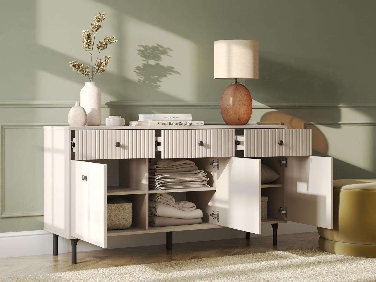 Перед покупкой обязательно измерьте место, где будет стоять комод. Убедитесь, что ящики и фасады свободно открываются и не упираются в дверь, стены или другую мебель.