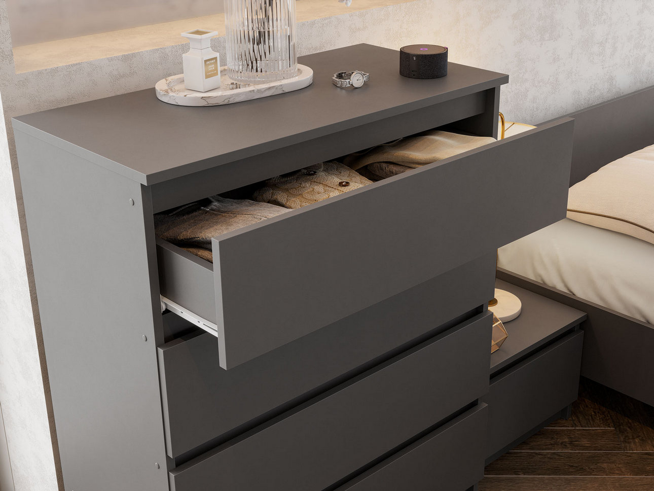Начнем с фурнитуры — тех незаметных «помощников», которые во многом определяют, удобно ли пользоваться комодом. Представьте: раннее утро, вы хотите быстро достать одежду, а ящик громко скрипит и заедает. Или нужно взять из комода пижаму, не разбудив при этом партнера, который уже спит.