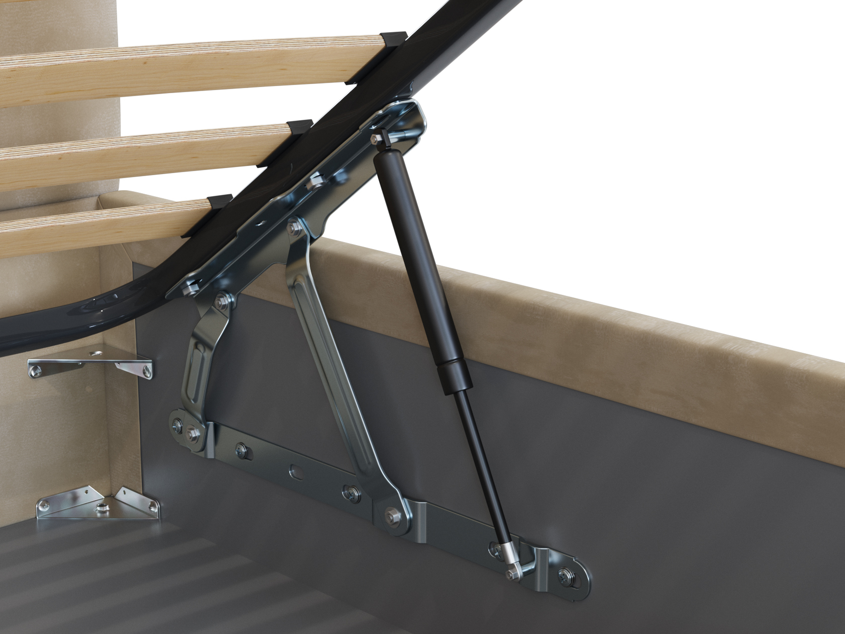 Есть три вида конструкции. Они отличаются по степени удобства и рассчитаны на разный срок службы. Ручной. Самый простой с точки зрения конструктива, при этом требует значительных физических усилий. Доступ к отсеку для хранения открывается с помощью прочного ремня (или тканевой ручки), за который нужно потянуть вверх. Основание не фиксируется в поднятом состоянии, поэтому доступ к ящику не самый удобный. В современных моделях этот механизм встречается крайне редко. Пружинный. Здесь в качестве подъемной силы работают несколько витых пружин. Поднять тяжелый матрас легче, чем при ручном способе, но приложить усилия все же потребуется. Механизм срабатывает достаточно плавно и, как правило, оснащен специальным блокиратором, который не дает основанию упасть вниз. Со временем пружины растягиваются, поэтому такой вариант не подходит для частого использования. Газлифт. Самый удобный и практичный вариант. Основание поднимается за счет энергии расширяющегося газа и надежно удерживается в верхней точке. Можно спокойно искать / складывать / доставать нужную вещь, а также поддерживать чистоту короба. Чтобы опустить матрас обратно, достаточно потянуть его вниз. Он плавно опустится под собственным весом. Механизм надежный и рассчитан на несколько тысяч циклов, а значит, прослужит долго и не сломается от частых подъемов.