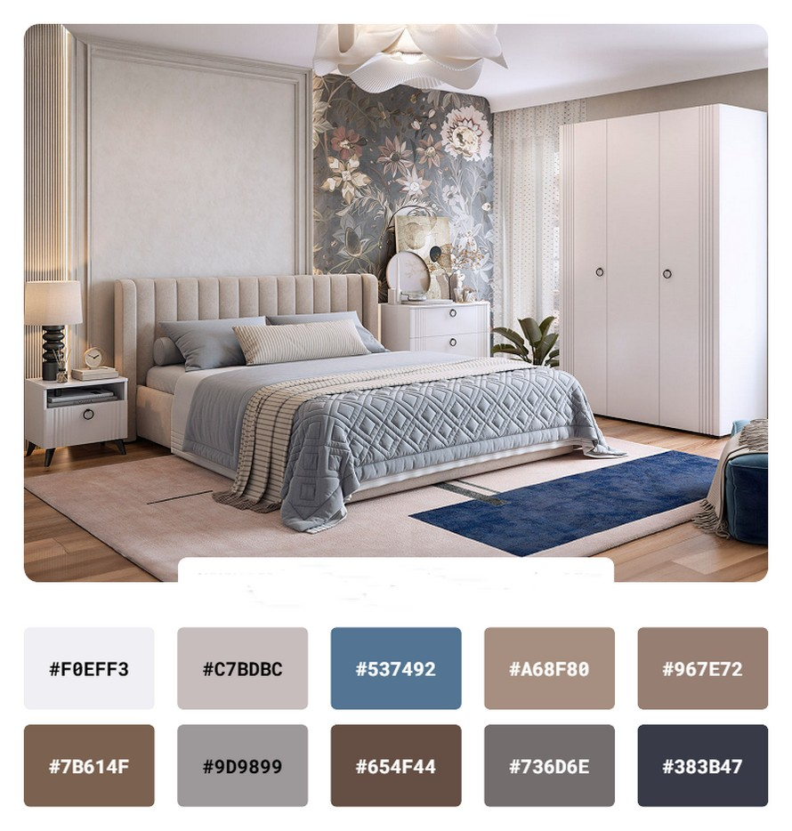 Если спальня уже полностью обустроена, важно грамотно встроить оттенок кровати в общую палитру. Для этого сделайте несколько фото интерьера в светлое время суток, загрузите в смартфон, ноутбук или компьютер. С помощью специальных онлайн-сервисов можно получить готовую схему уже используемых в спальне оттенков.