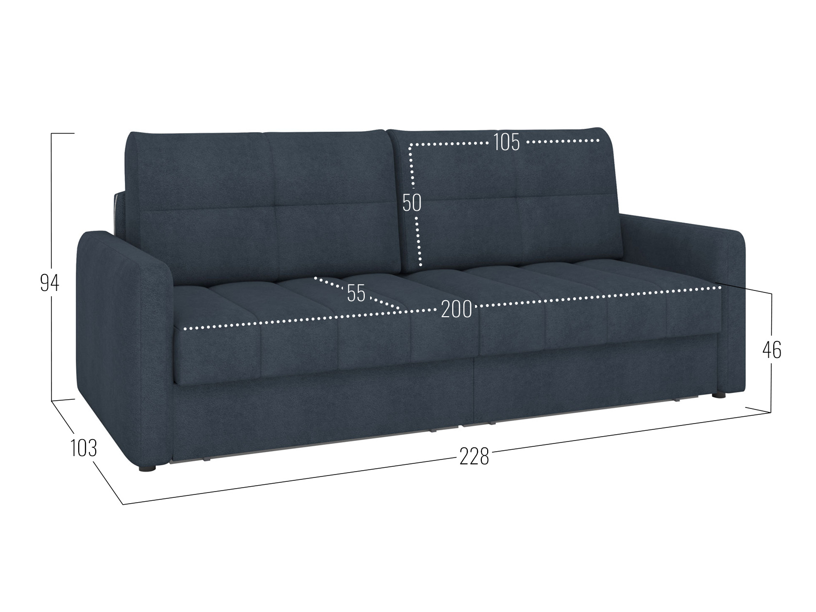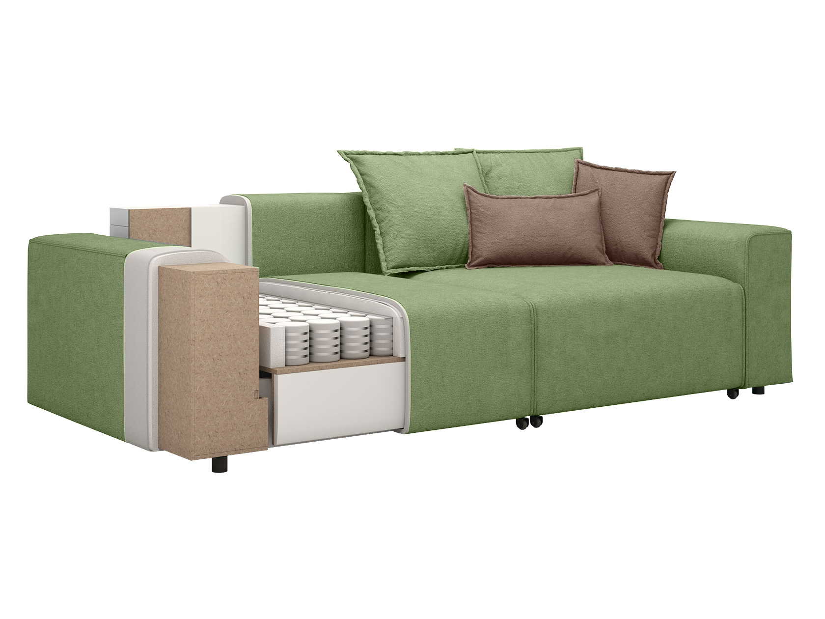 Один из лучших прямых диванов для сна. Основа — металлический каркас: прочный, долговечный и надежный. Рама с гибкими ламелями, независимый пружинный блок и удобный механизм трансформации создают ровное спальное место, сравнимое по комфорту с полноценной кроватью.