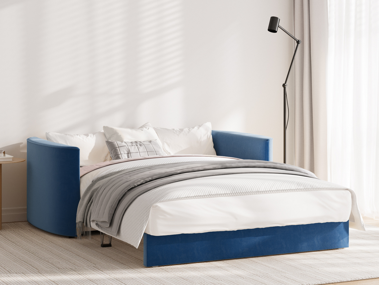 Когда диван разложен, небольшая планка защищает от контакта со стеной, а скругленные подлокотники создают особую приватность и ощущение защищенности во время сна. В отзывах обращают внимание на легкую сборку и то, что диван удобно складывается и раскладывается.