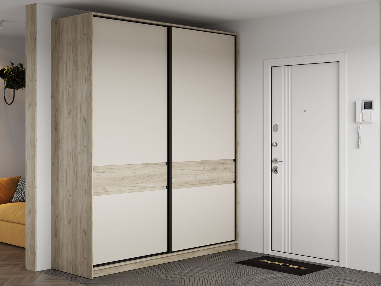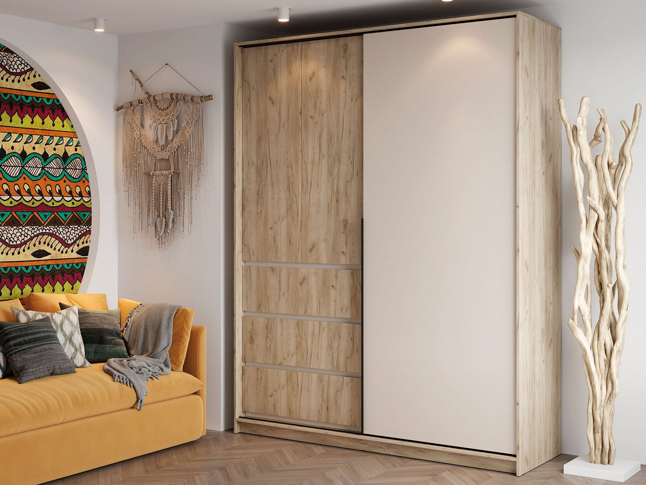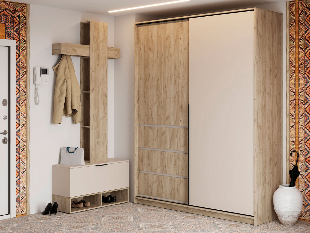 Дизайн шкафа строится на сочетании двух оттенков — фактурного теплого «крафта» и однотонного белого цвета. Такое исполнение добавляет интерьеру визуальную глубину и динамику.