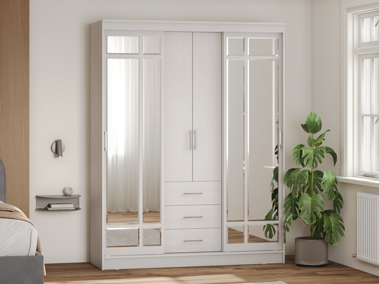 Зеркала с фацетом визуально расширяют пространство и добавляют интерьеру легкости, а оттенок «ясень белый» смотрится свежо и актуально. Такой дизайн помогает сделать комнату светлее, особенно в помещениях с дефицитом солнечных лучей. Но при желании эту модель можно заказать и с темным оттенком корпуса.
