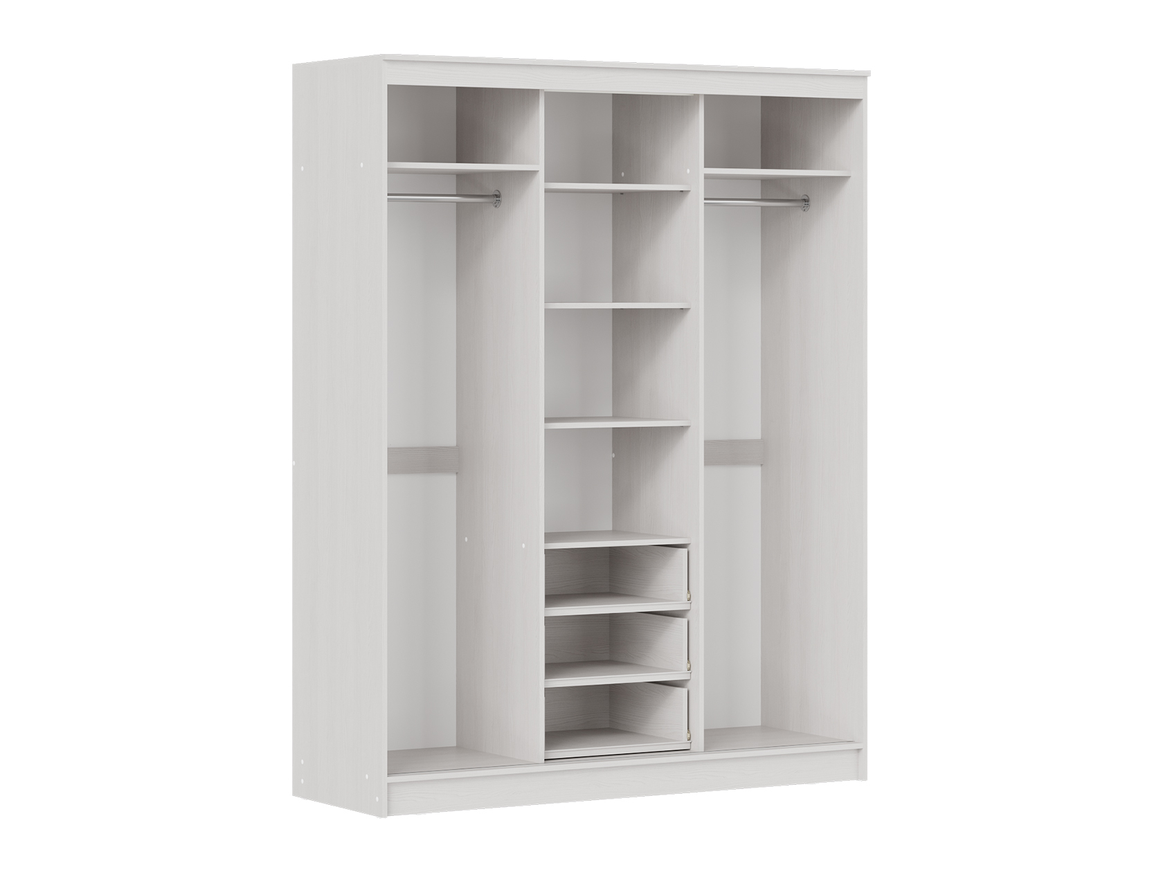 Внутреннее наполнение организовано рационально — в шкафу хватит места для повседневной одежды, сезонных вещей и аксессуаров, а грамотная планировка секций поможет поддерживать порядок. Конструкция выполнена из качественного ЛДСП — надежного материала по доступной цене.