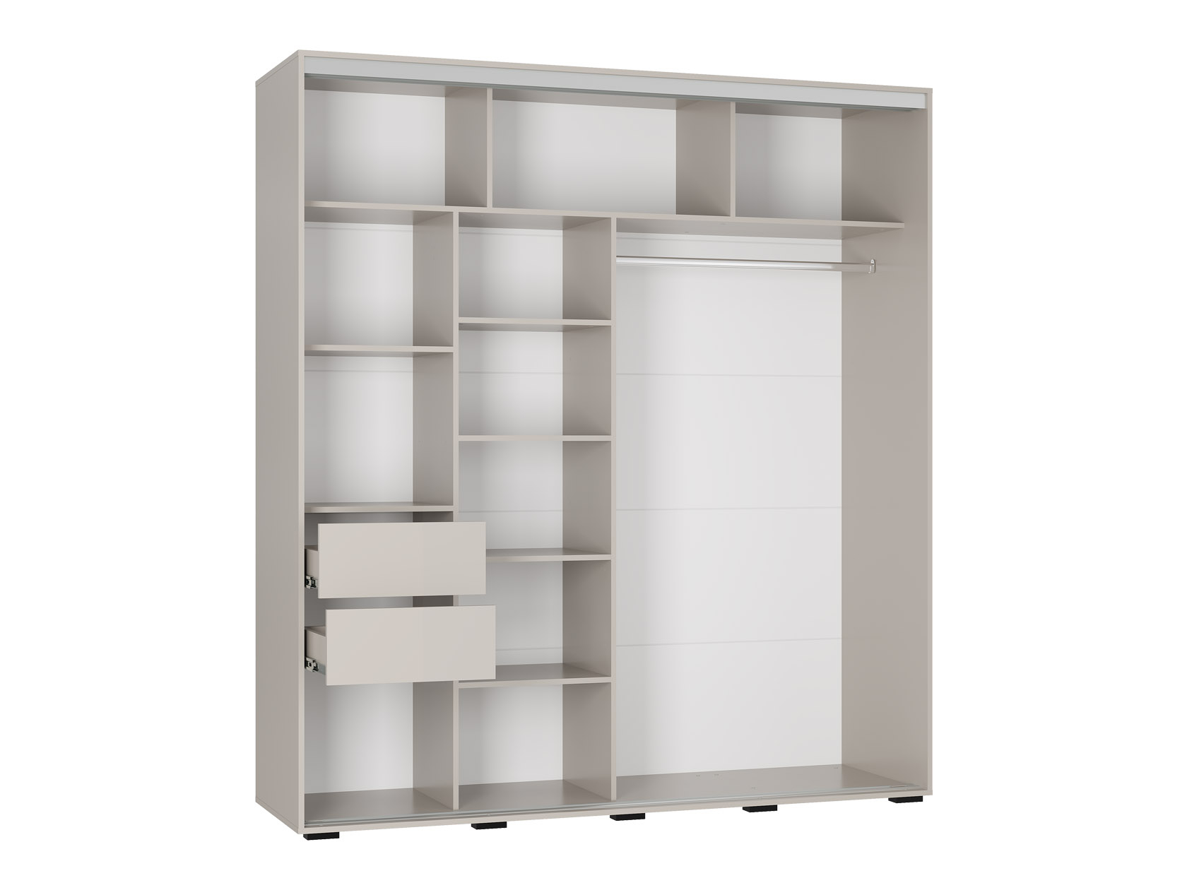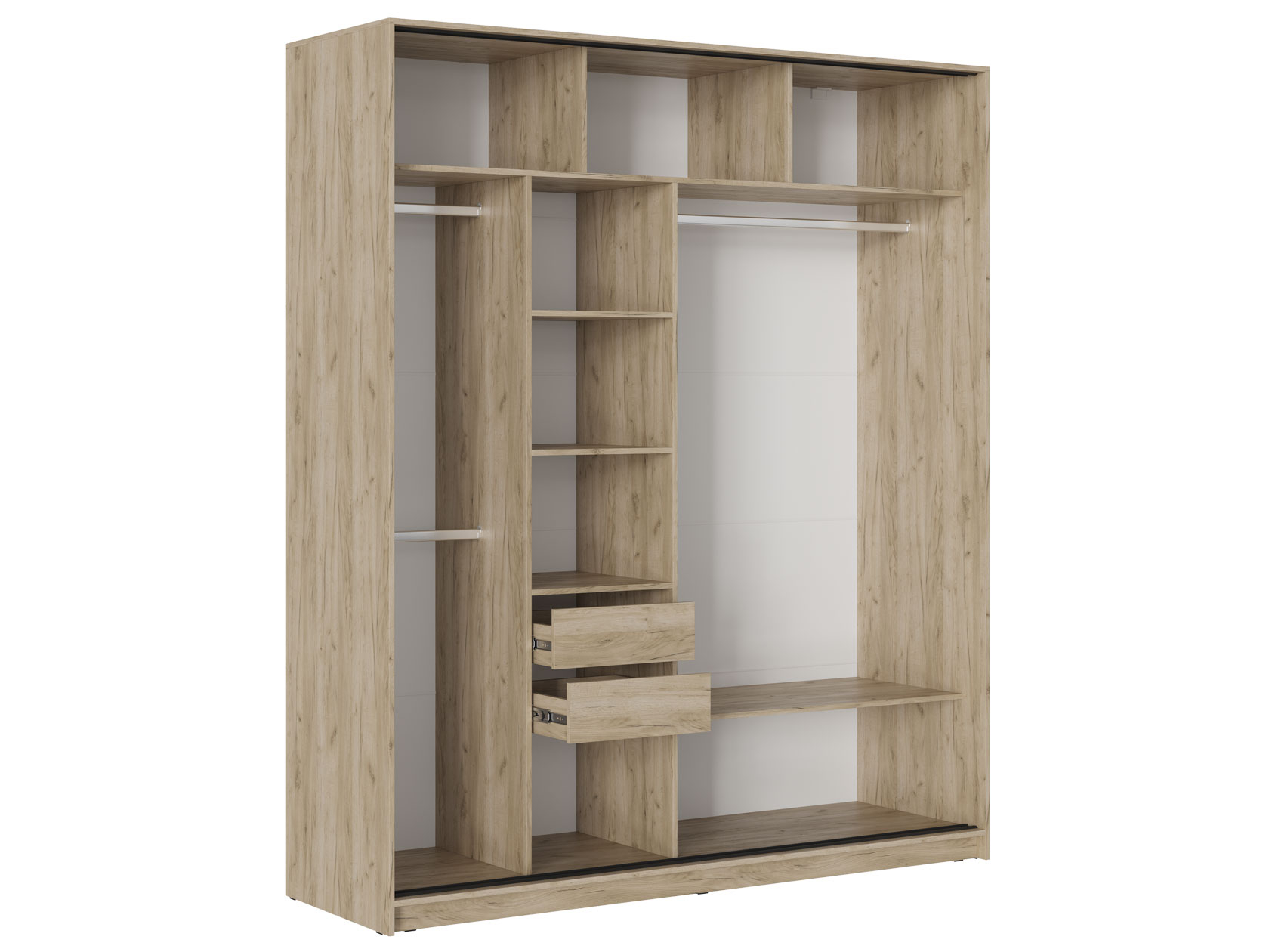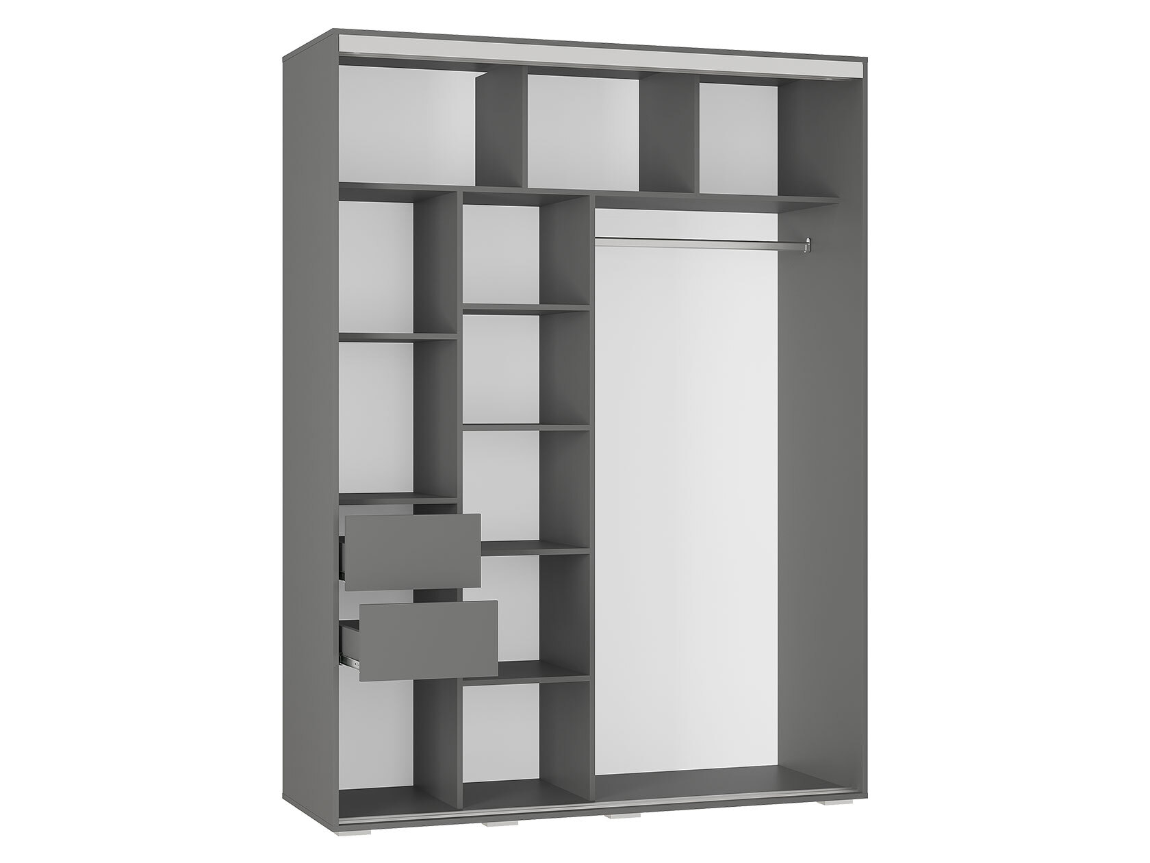 Модель привлекает не только внешним видом, но и внутренней организацией. Большая ниша со штангой для одежды на плечиках, удобные полки для сложенных вещей, а также ящики, позволяющие аккуратно разместить мелкие предметы — от белья до украшений