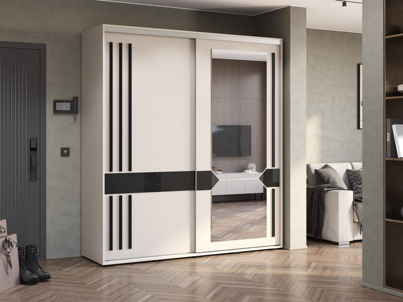 В оформлении фасадов используются лакобель и зеркальные элементы с необычной геометрией. Шкаф сочетает визуальную привлекательность при балансе цены и практичности. Оттенок «кашемир» остается популярным не случайно: он смотрится современно, благородно и нескучно. Цвет не перегружает пространство, а, напротив, создает спокойную и уютную атмосферу, выступая отличной базой для любых декоративных акцентов.