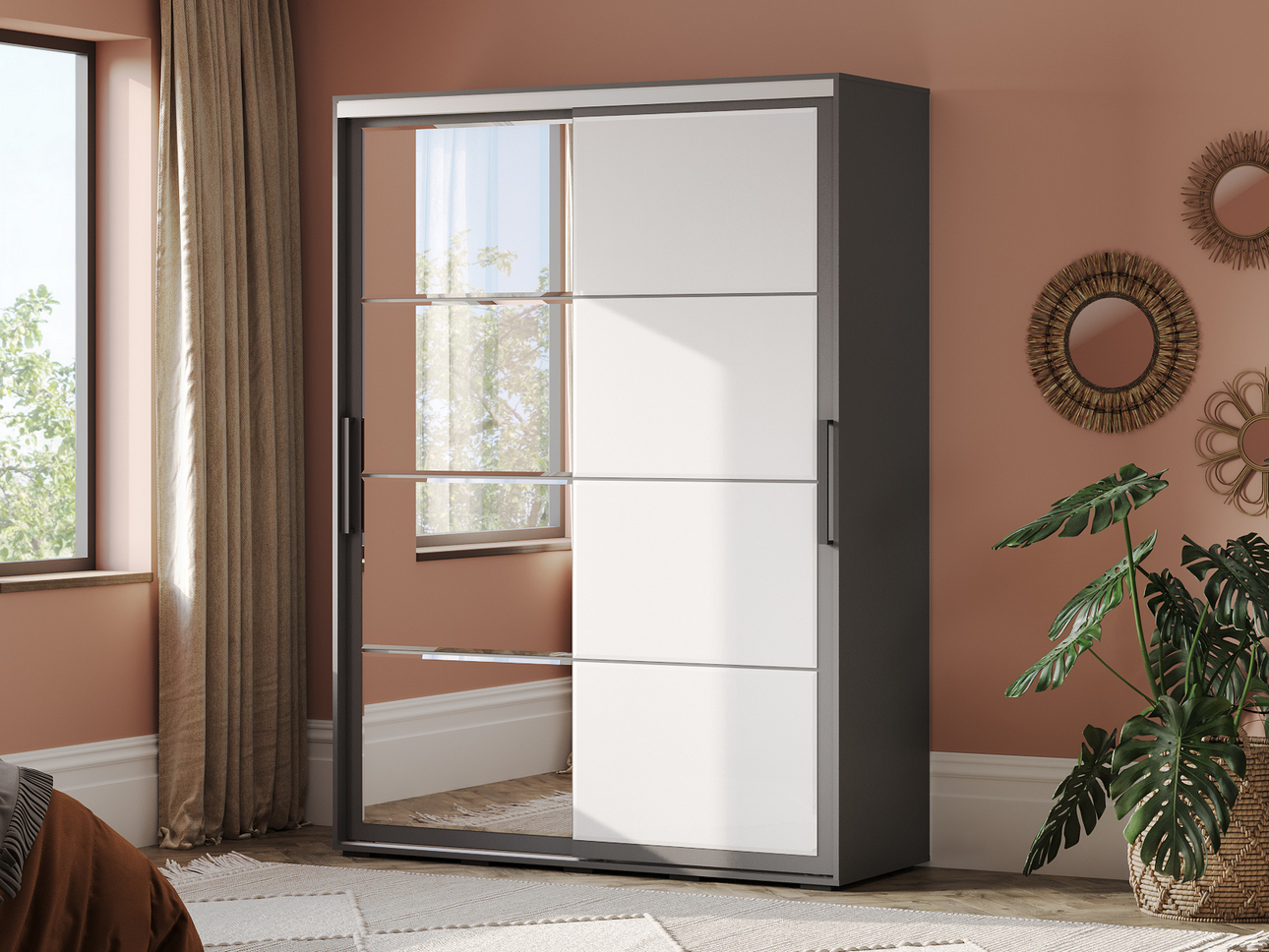 Дизайн шкафа построен на принципах лаконичности и универсальности. Графитовый оттенок выглядит строго и современно, не выходит из моды и без труда сочетается с разной мебелью и отделкой. Это, прежде всего, надежное решение для интерьера, в котором не нужны лишние детали, при этом важна симметрия и глубина.