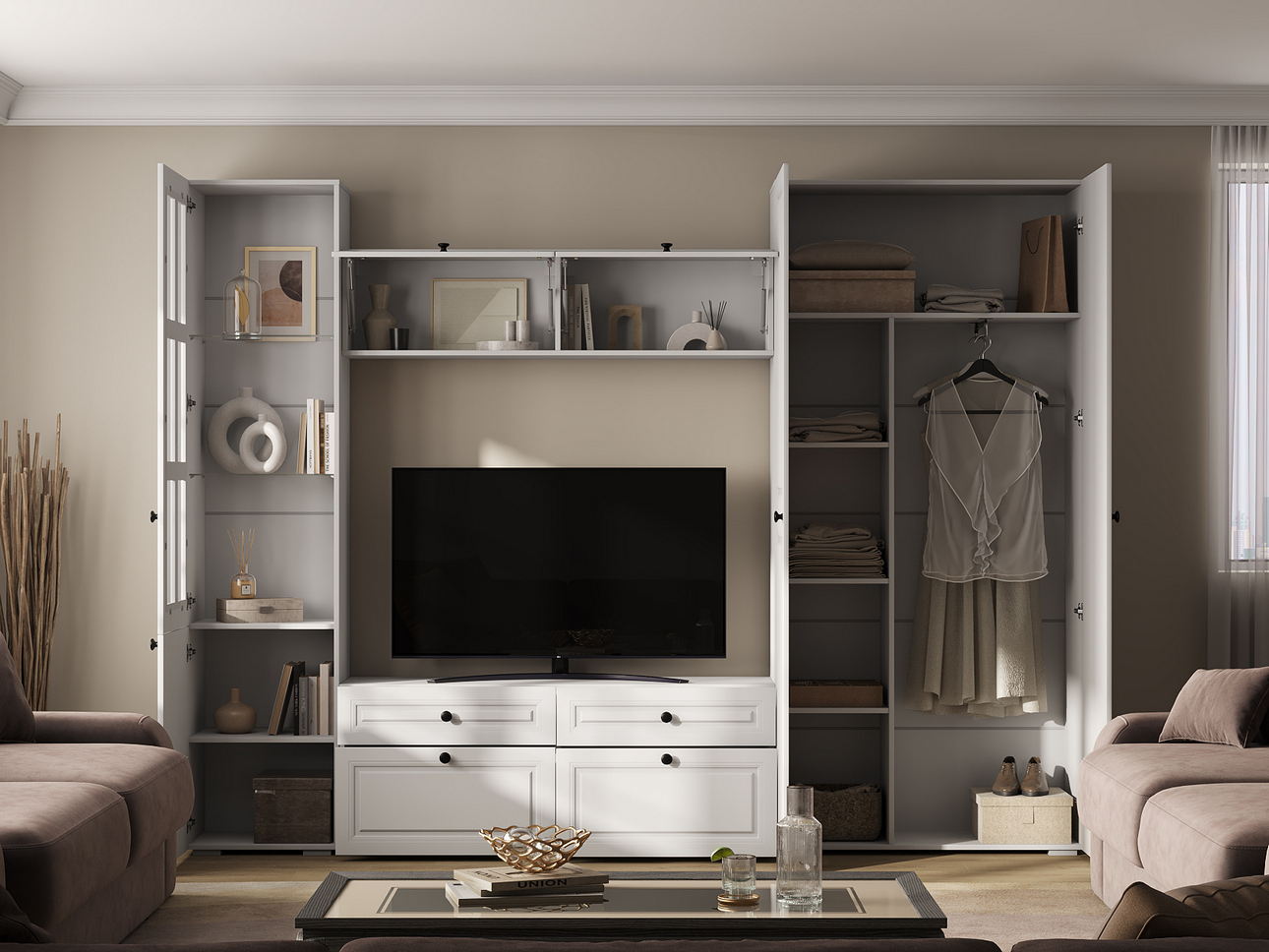 Эстетика и приватность. Отдельное помещение скрывает вещи от посторонних глаз, сохраняя порядок, общий стиль и привлекательность основной комнаты.