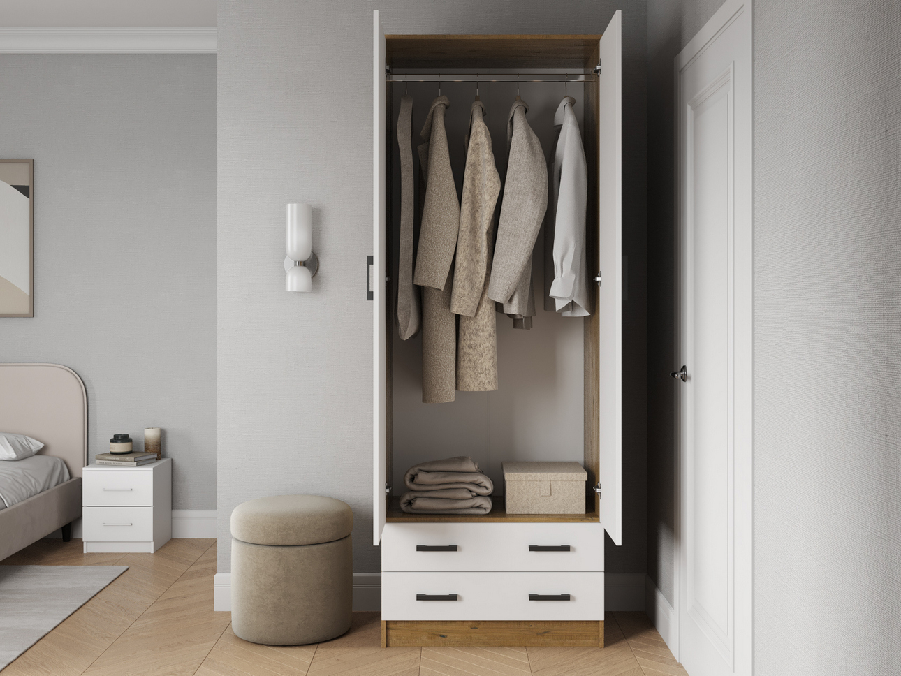 Все зависит от доступного пространства и потребностей в хранении. Прежде всего нужно оценить количество вещей и состав гардероба. После этого определить какую площадь можно выделить для хранения.Гардеробный шкаф — если нужно универсальное решение, и нет возможности выделить отдельную комнату.