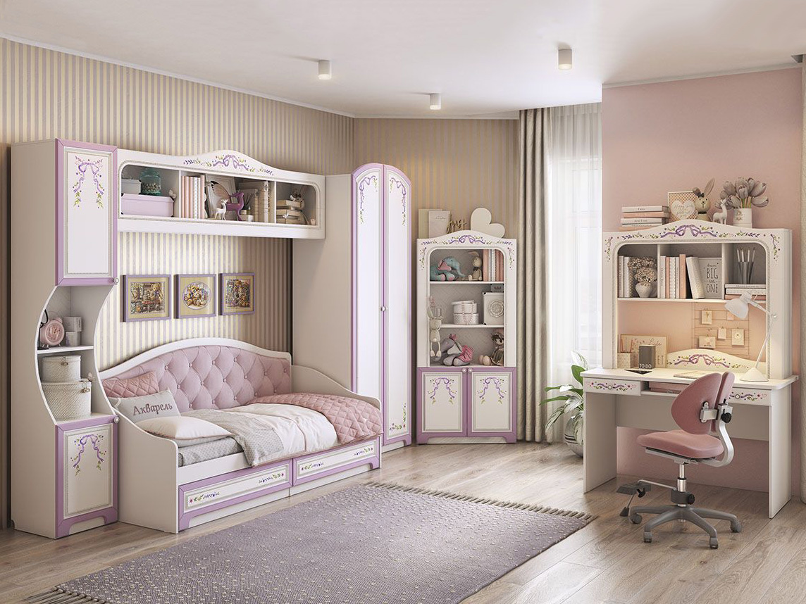 Акварель — модульная серия мебели для оформления комнаты для девочки. Коллекция выполнена в нежных тонах, которые непременно понравятся маленькой принцессе.