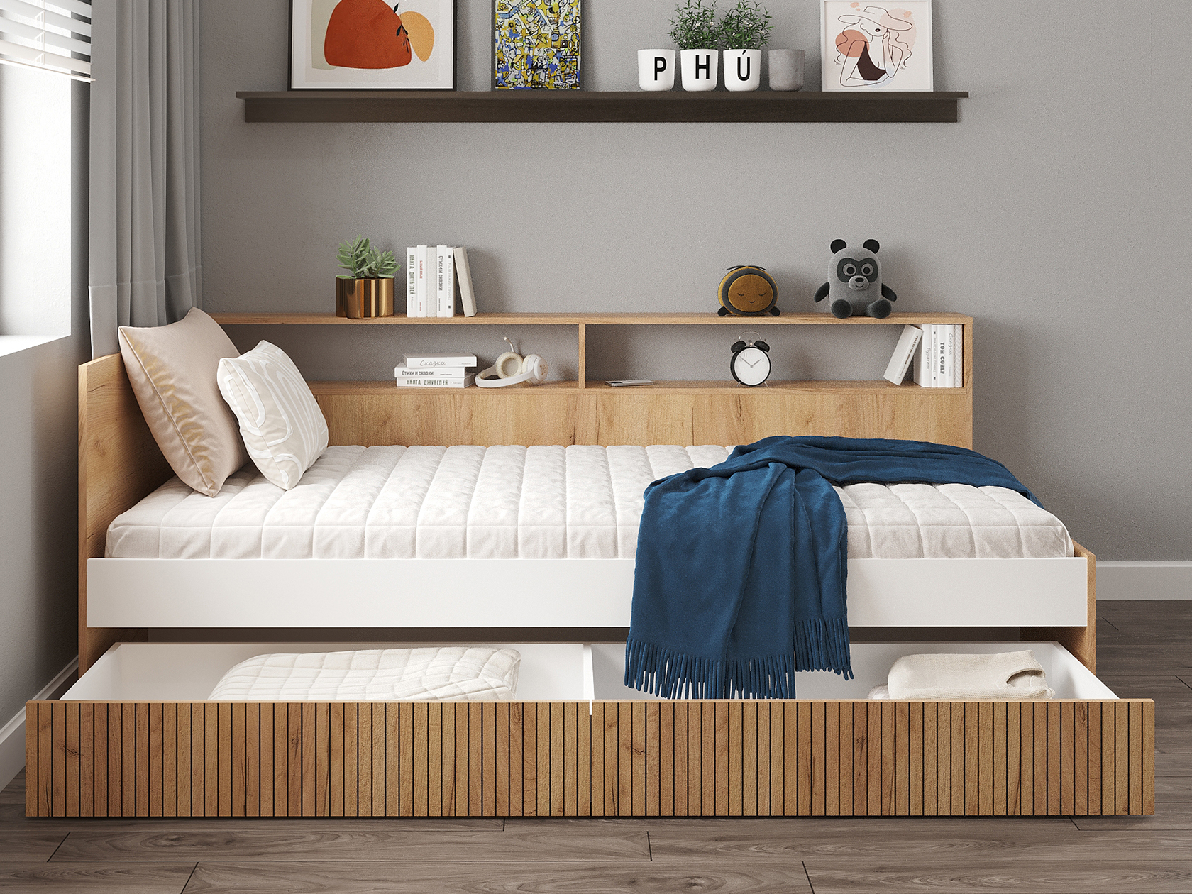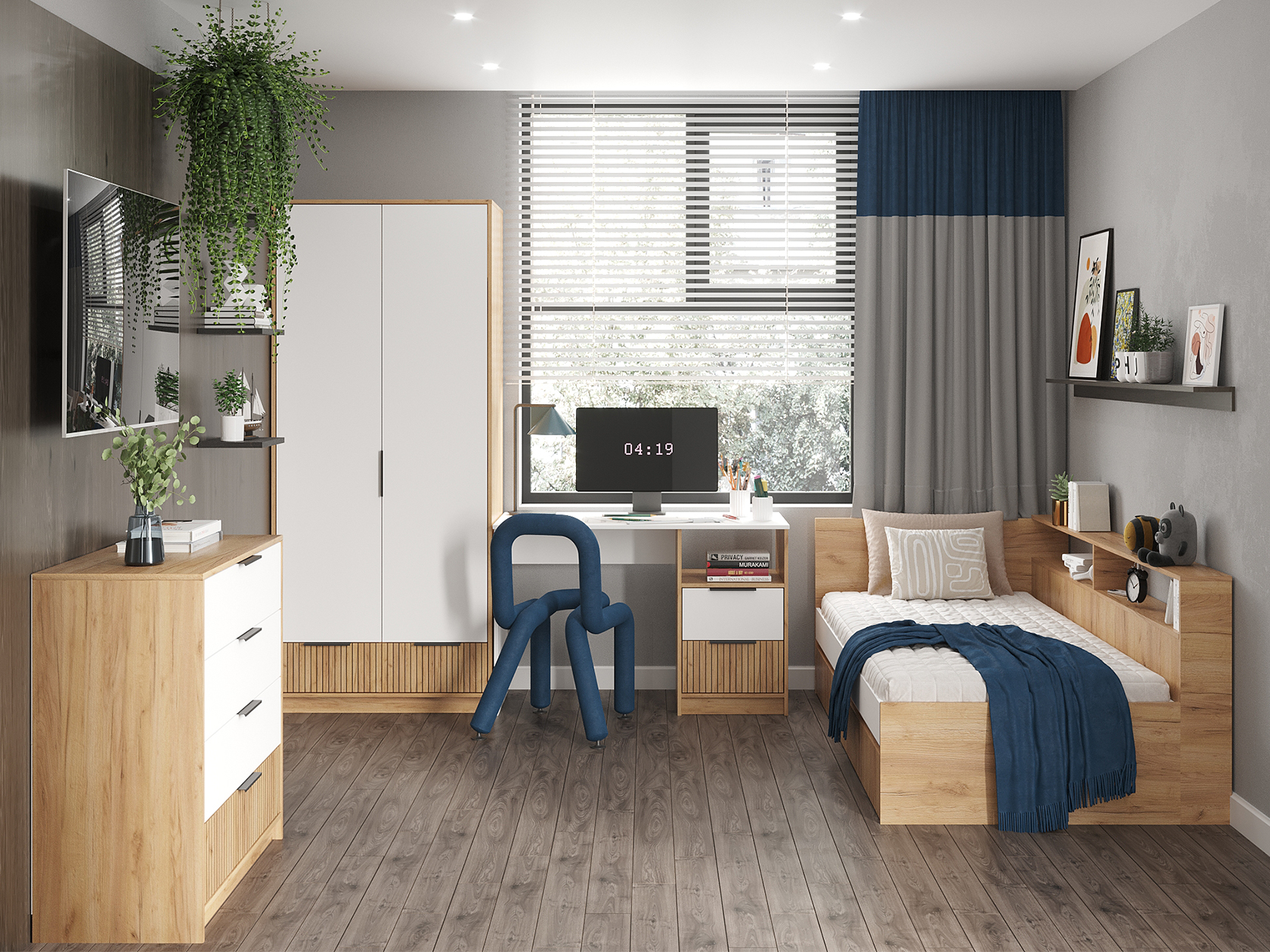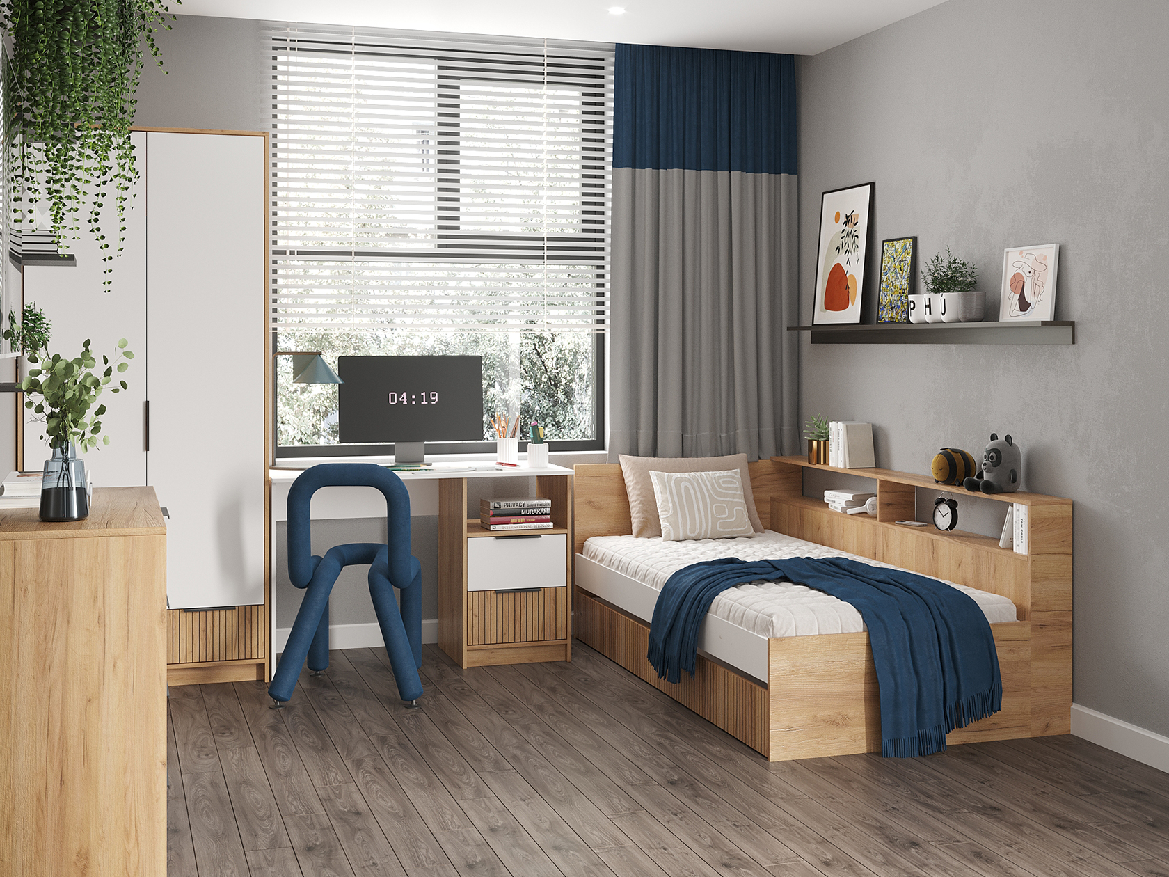 Модульная детская Ивис — практичное решение для оформления комнаты ребенка школьного возраста. Элементы коллекции позволяют создать визуально приятную обстановку. Для хранения учебников, книг, игрушек, одежды и других вещей предусмотрены шкаф, комод и открытые ниши. Удобная кровать и письменный стол помогут разделить зону для учебы и место для отдыха. Фасады с фотопечатью выступают уютными деталями интерьера.