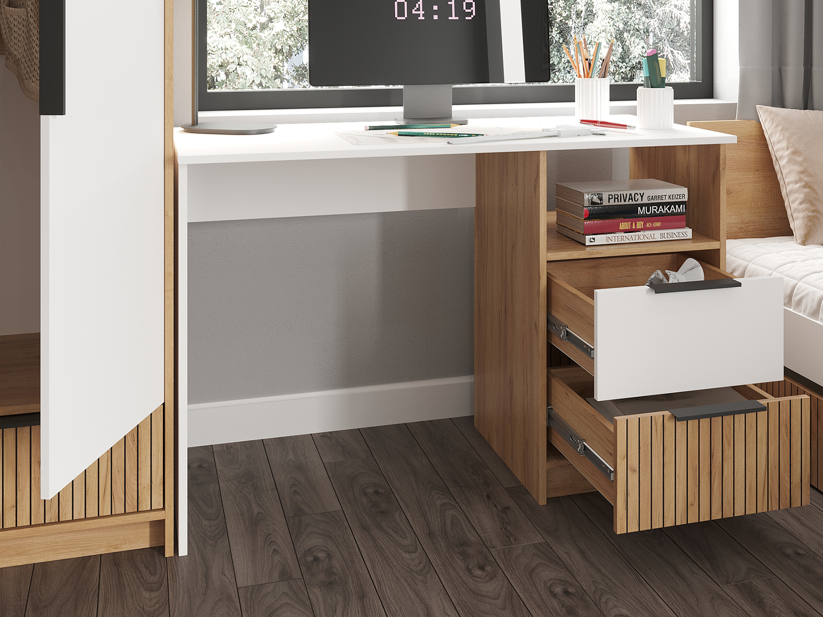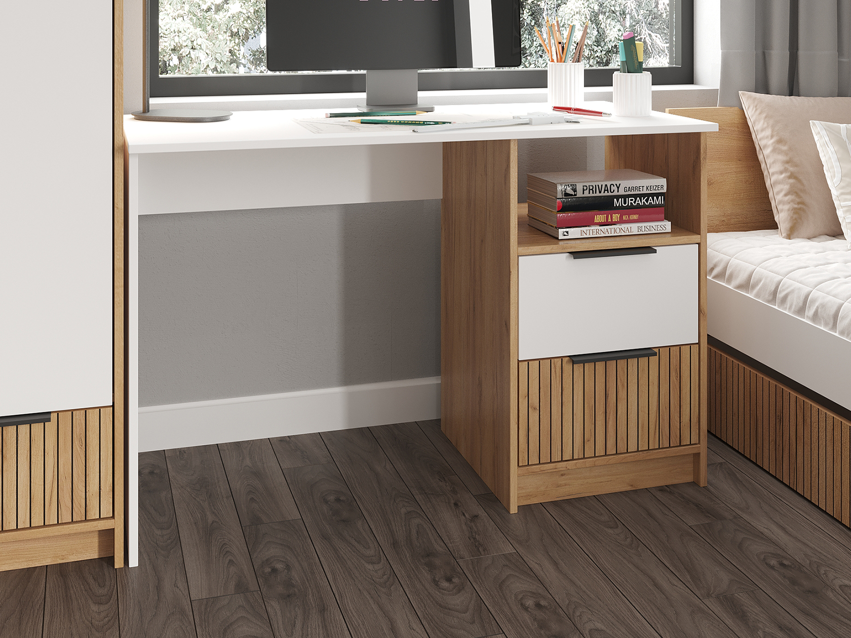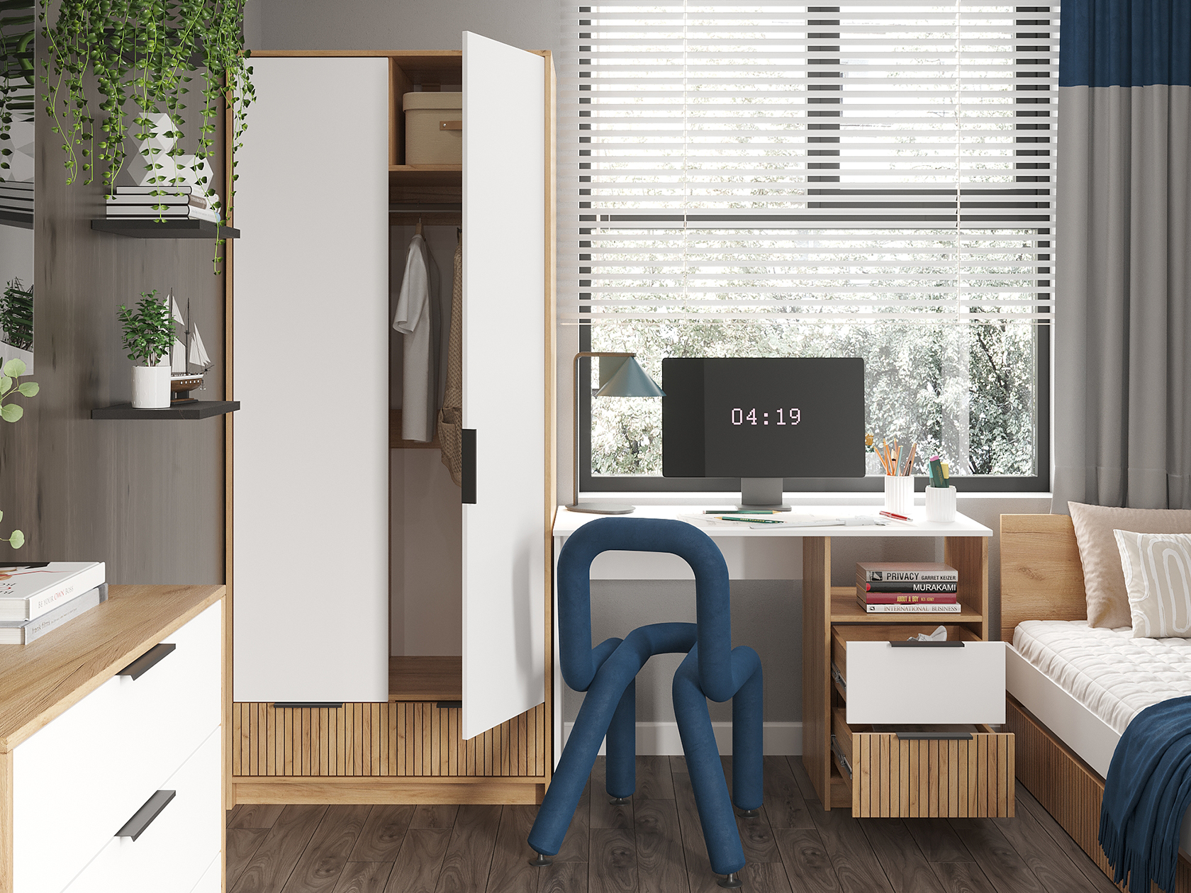 Модульная детская Ивис — практичное решение для оформления комнаты ребенка школьного возраста. Элементы коллекции позволяют создать визуально приятную обстановку. Для хранения учебников, книг, игрушек, одежды и других вещей предусмотрены шкаф, комод и открытые ниши. Удобная кровать и письменный стол помогут разделить зону для учебы и место для отдыха. Фасады с фотопечатью выступают уютными деталями интерьера.