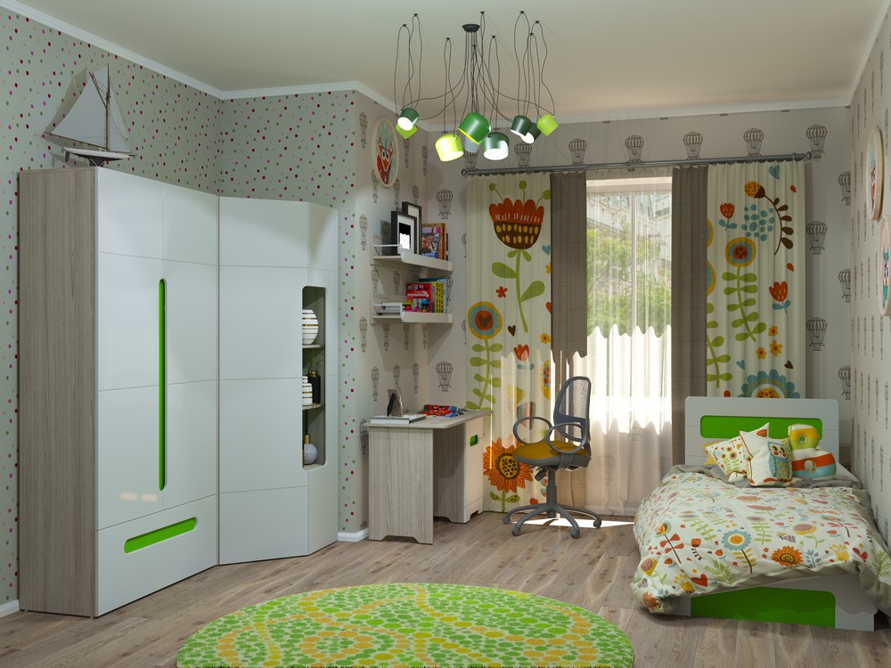 Рабочая зона представлена письменным столом с глубокой столешницей для размещения ноутбука, также предусмотрена встроенная тумба для размещения канцелярских принадлежностей. Система хранения организована группой распашных шкафов с полками и штангой для одежды. Кровать с подъемным механизмом оснащена подъемным механизмом, что создает дополнительное место хранения постельных принадлежностей и сезонных вещей.