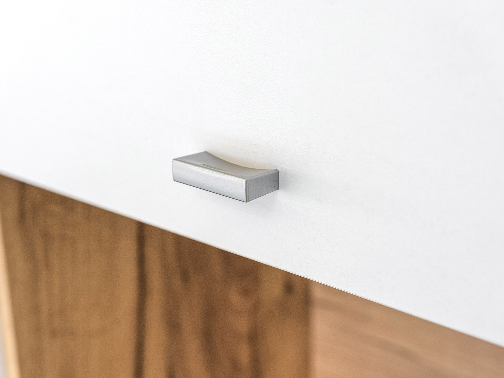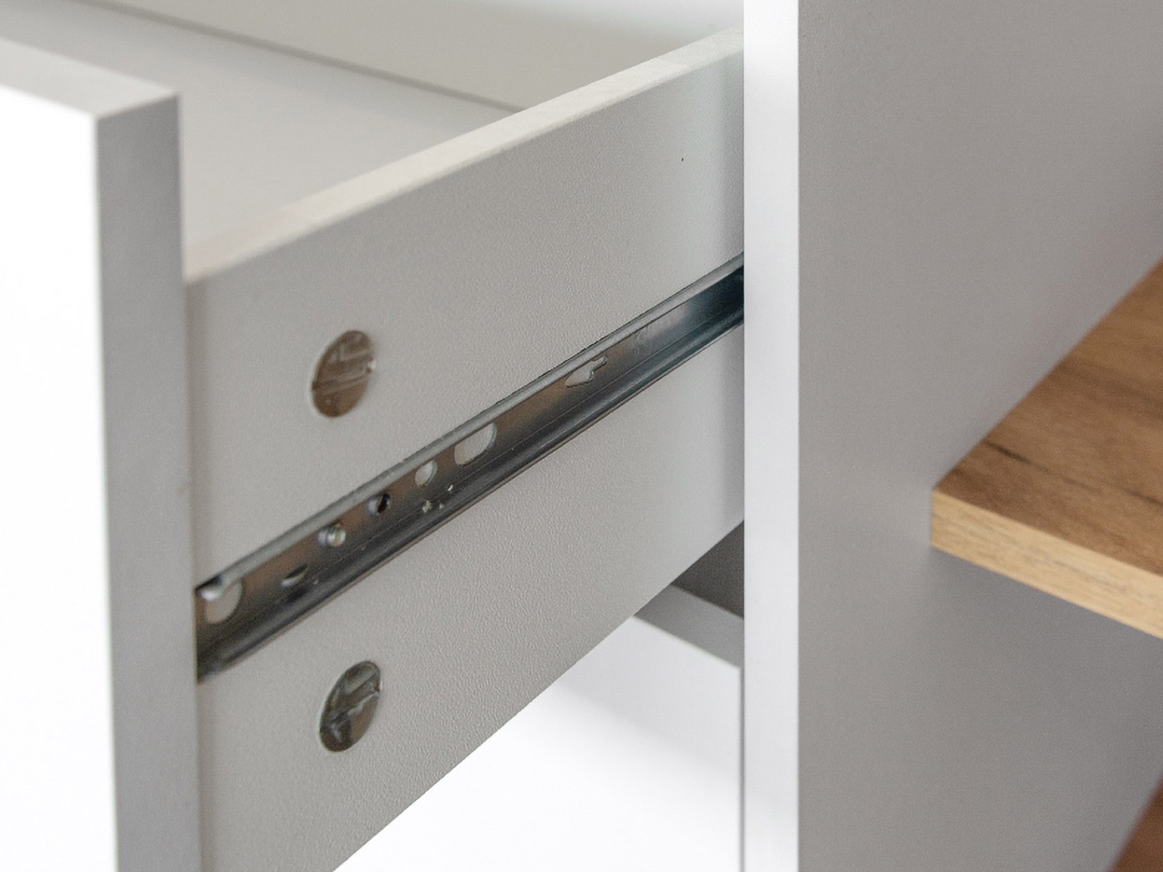 Для изготовления мебели используется ЛДСП 16 мм. Ручки и опоры выполнены из пластика. Распашные дверцы оснащены четырехшарнирными петлями, а в ящиках установлены шариковые направляющие полного выдвижения.