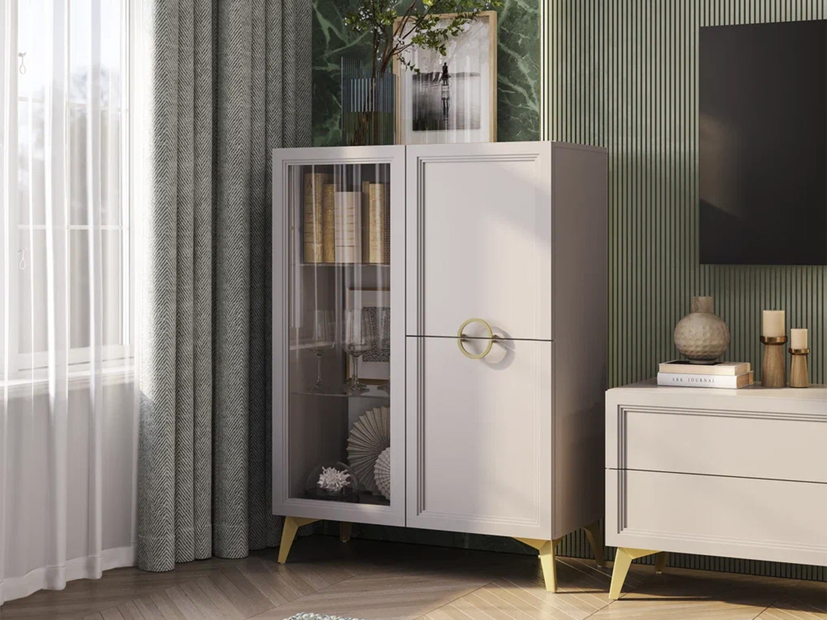 - Особенности С распашным шкафом, На ножках, Со шкафом-витриной, С местом под ТВ, С комодом