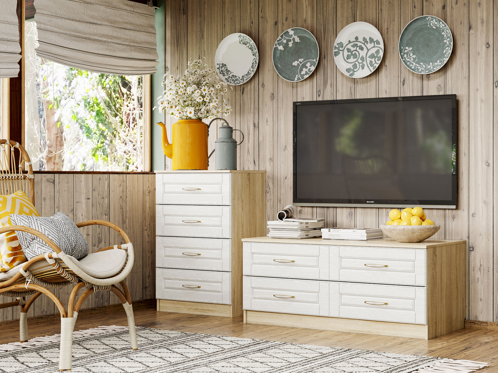 Корпуса выполнены из ЛДСП 16 мм, фасады — МДФ с пленкой ПВХ и стекло. Материал ручек — пластик. Выдвижные ящики оснащены шариковыми направляющими.