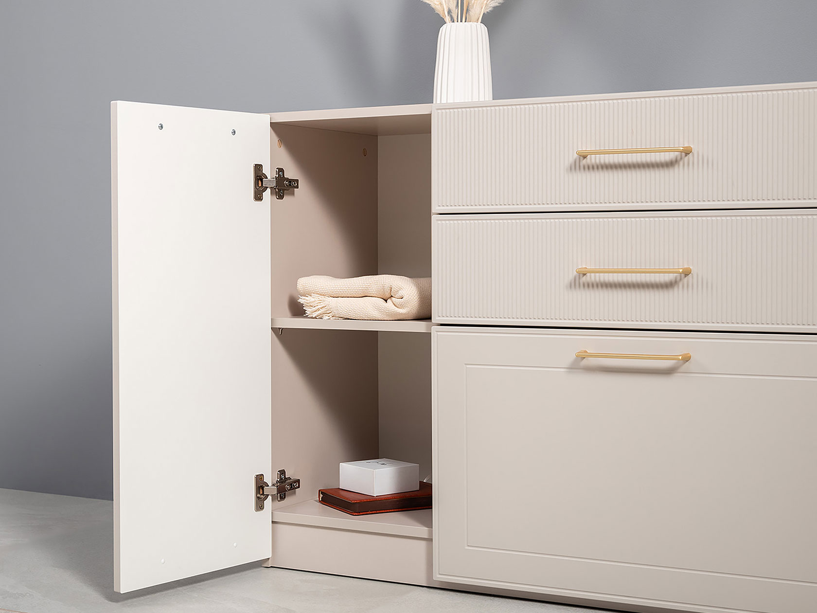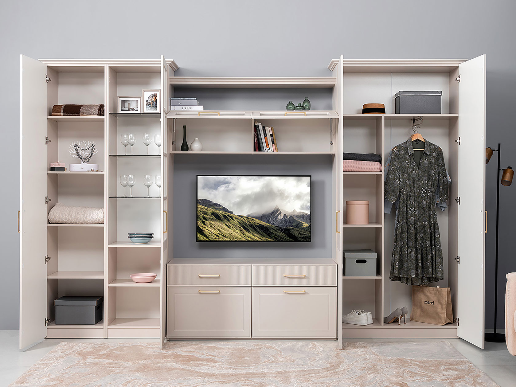 - Особенности С распашным шкафом, Со шкафом-витриной, С местом под ТВ, С комодом, С полками