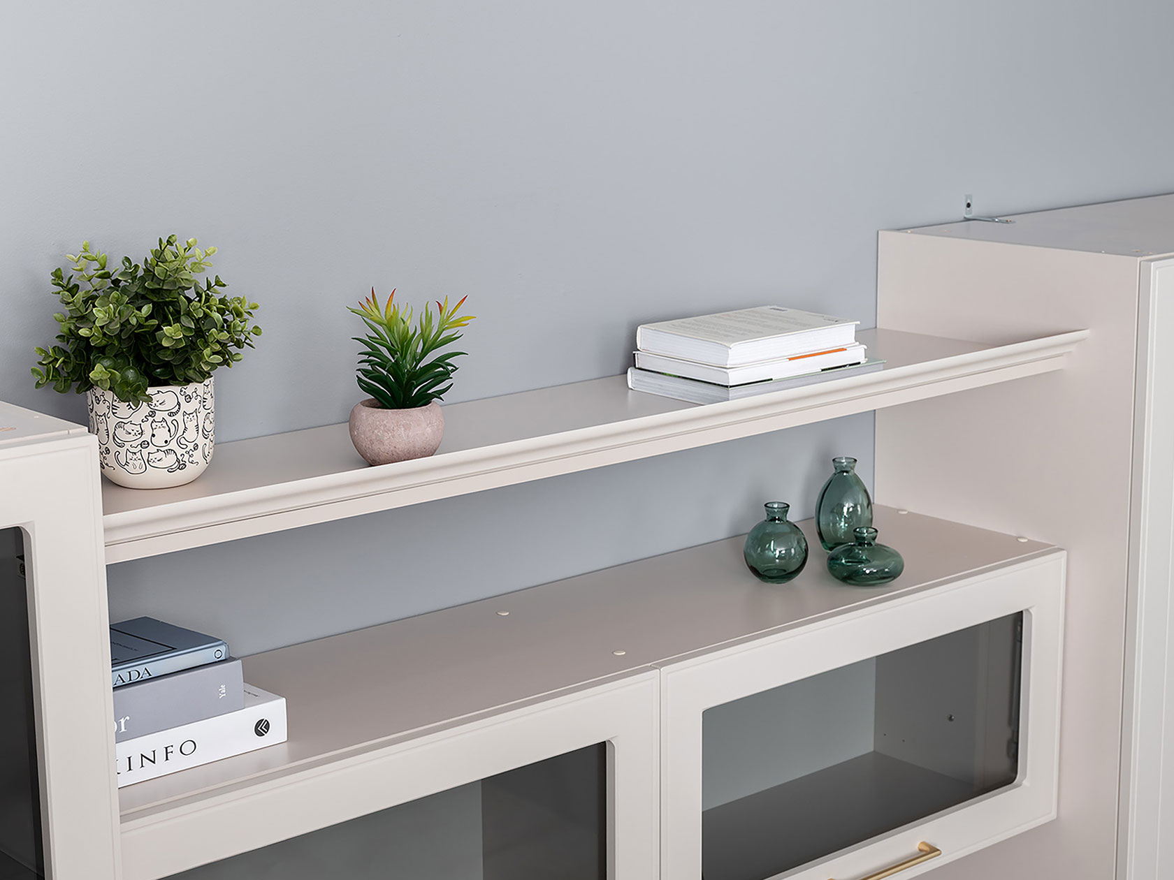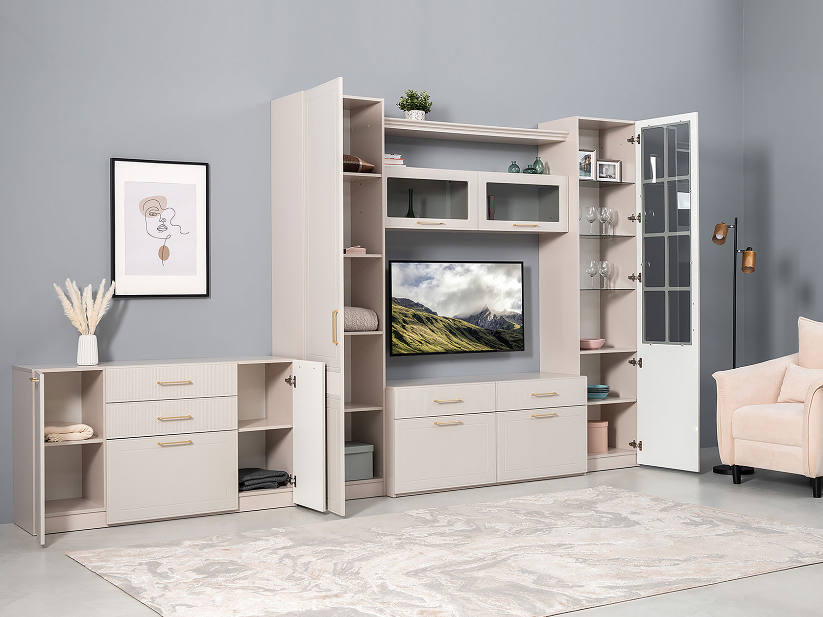 Модульные гостиные Ричфорд — это современная классика с акцентом на удобство и функциональность интерьера. Фрезерованные фасады, металлические ручки и витрины с тонированным стеклом придают обстановке элегантные акценты. Съемные полки делают эксплуатацию максимально комфортной. Карнизы гармонично завершают облик мебели.