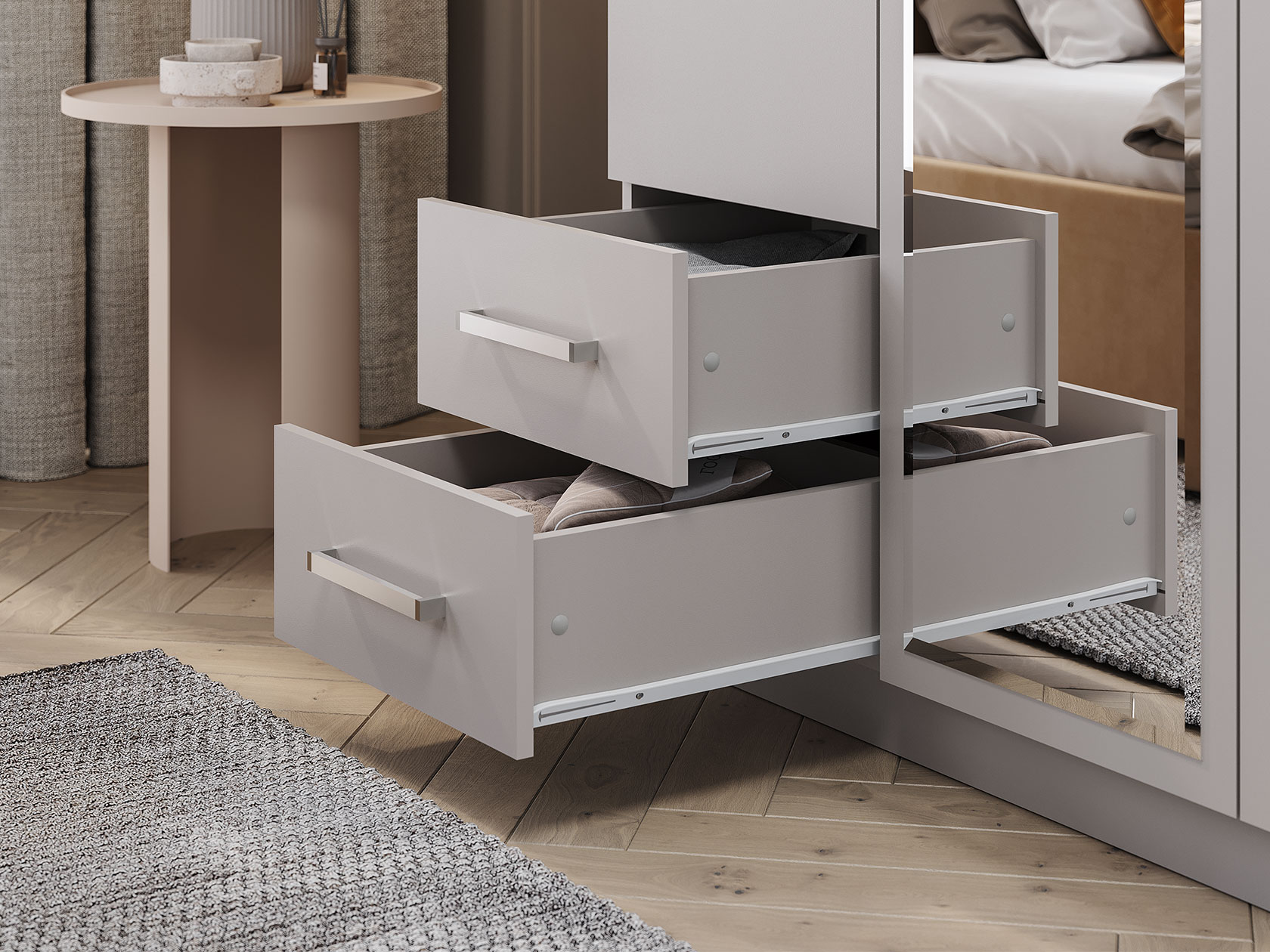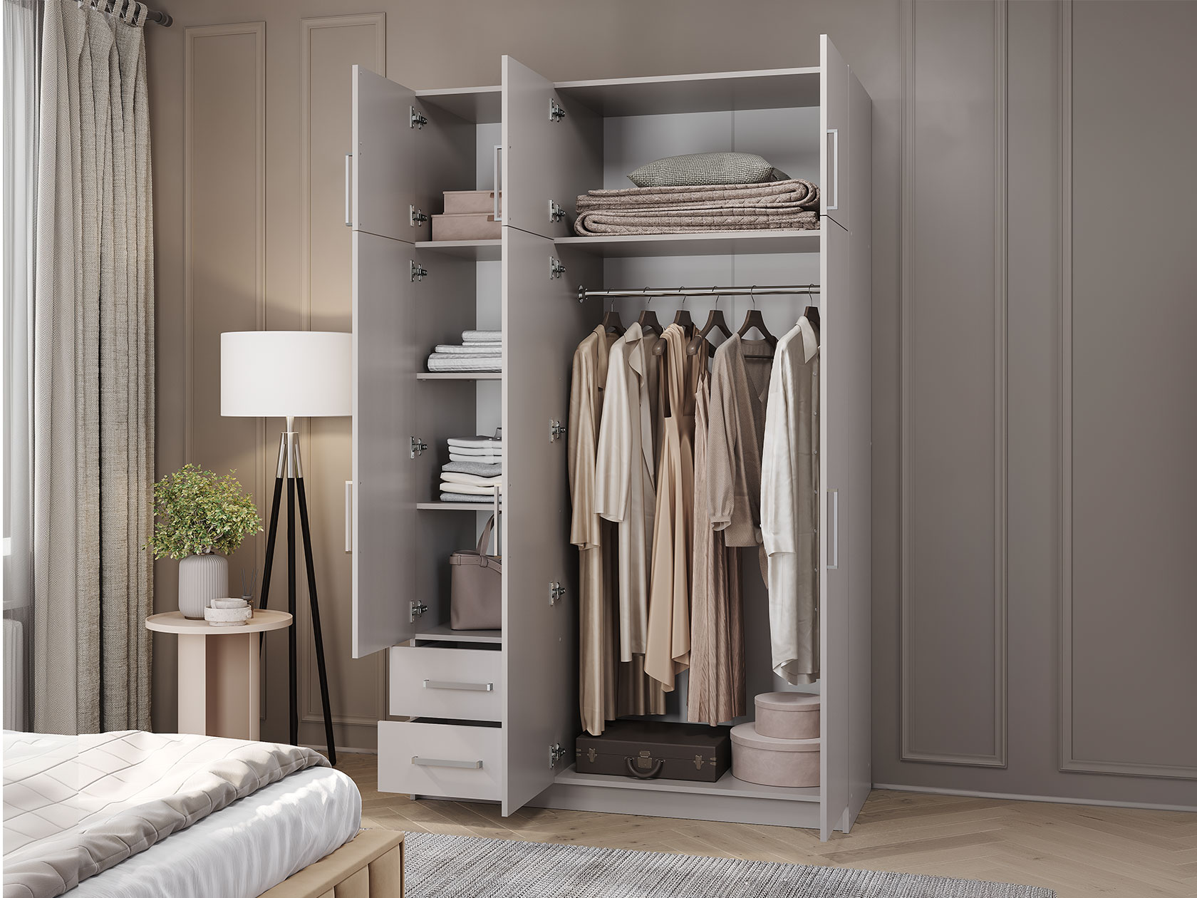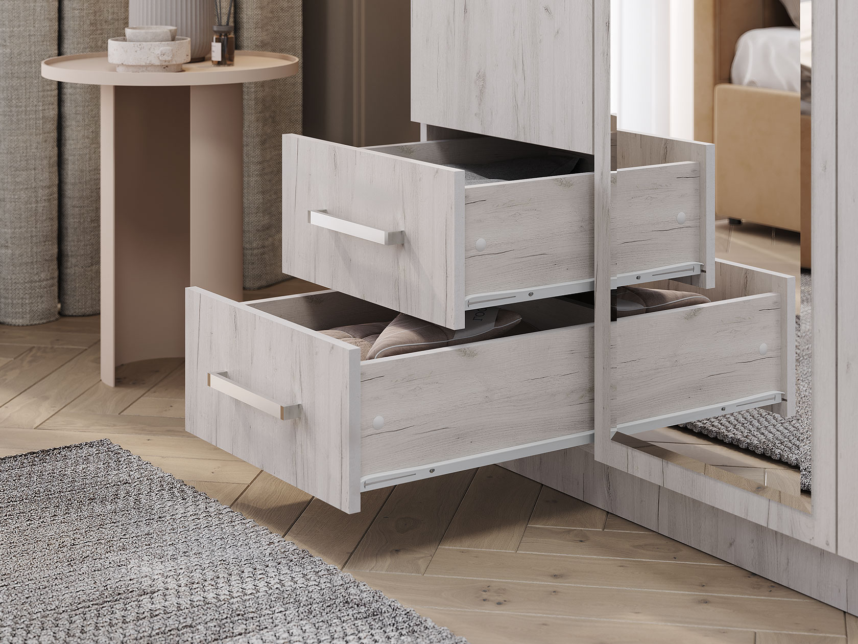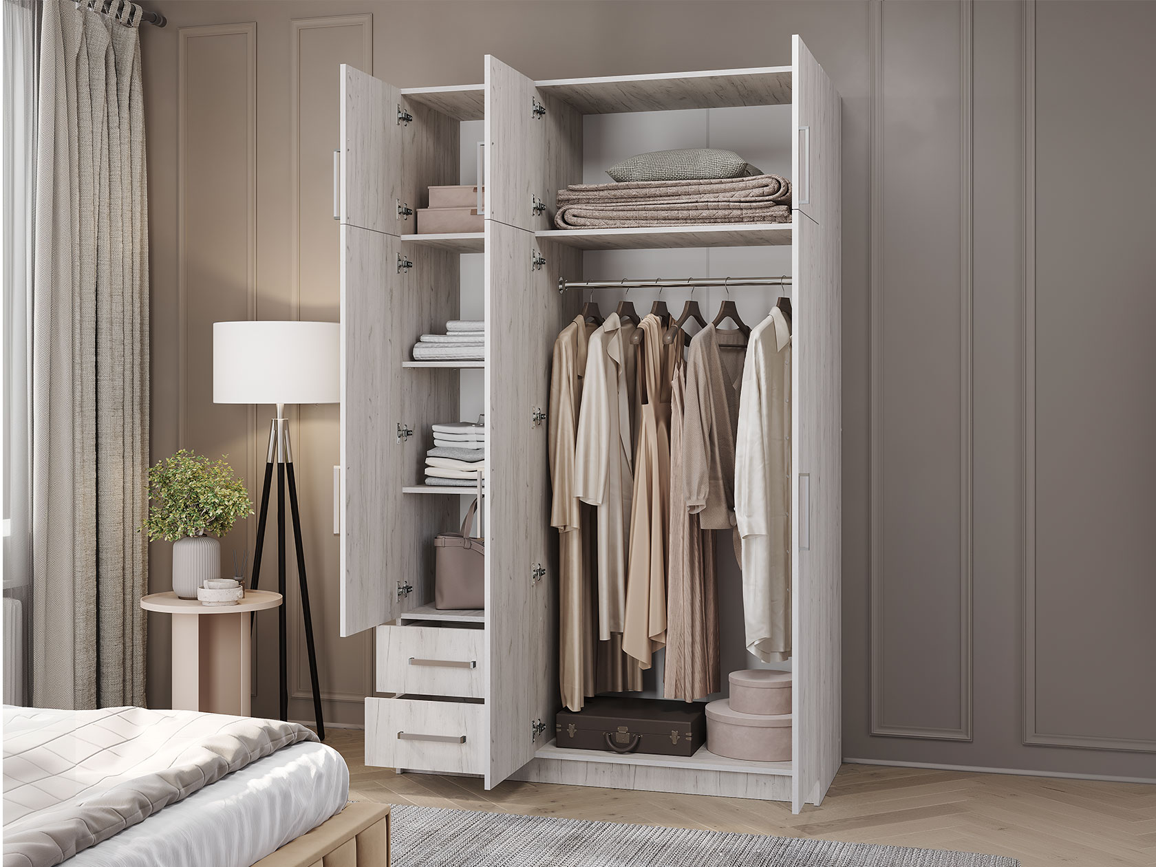 Модульные шкафы Розали порадуют вместительностью и лаконичным дизайном. Элементы коллекции продуманы с точки зрения практичности. Внутреннее оснащение позволяет организовать хранение сезонной и повседневной одежды, а также обуви, белья и аксессуаров. В дизайне сделан акцент на природные фактуры и строгую геометрию, что позволяет адаптировать мебель под современные стили интерьера.