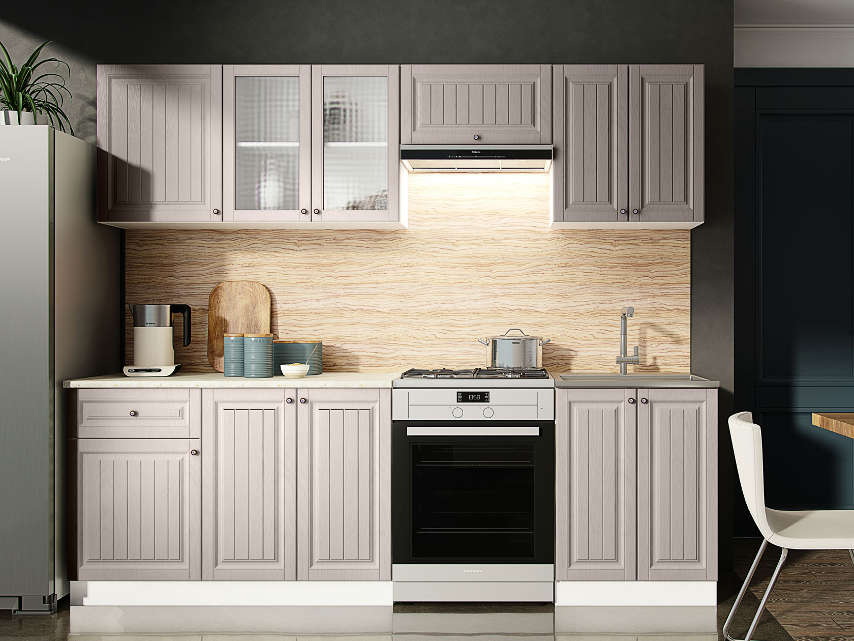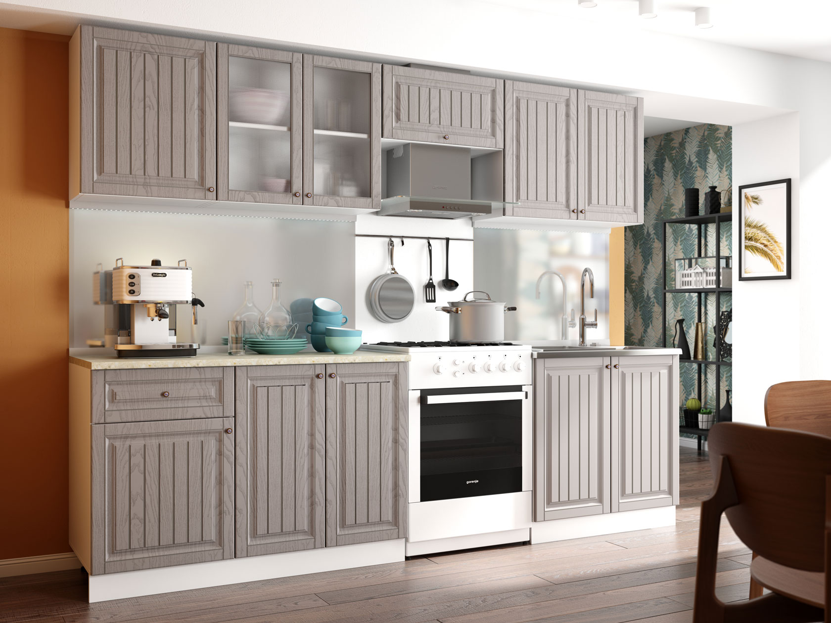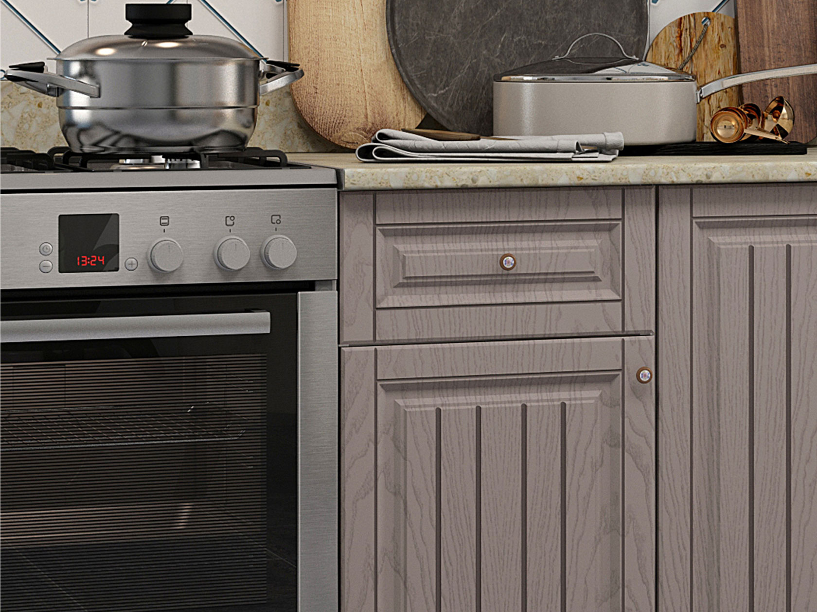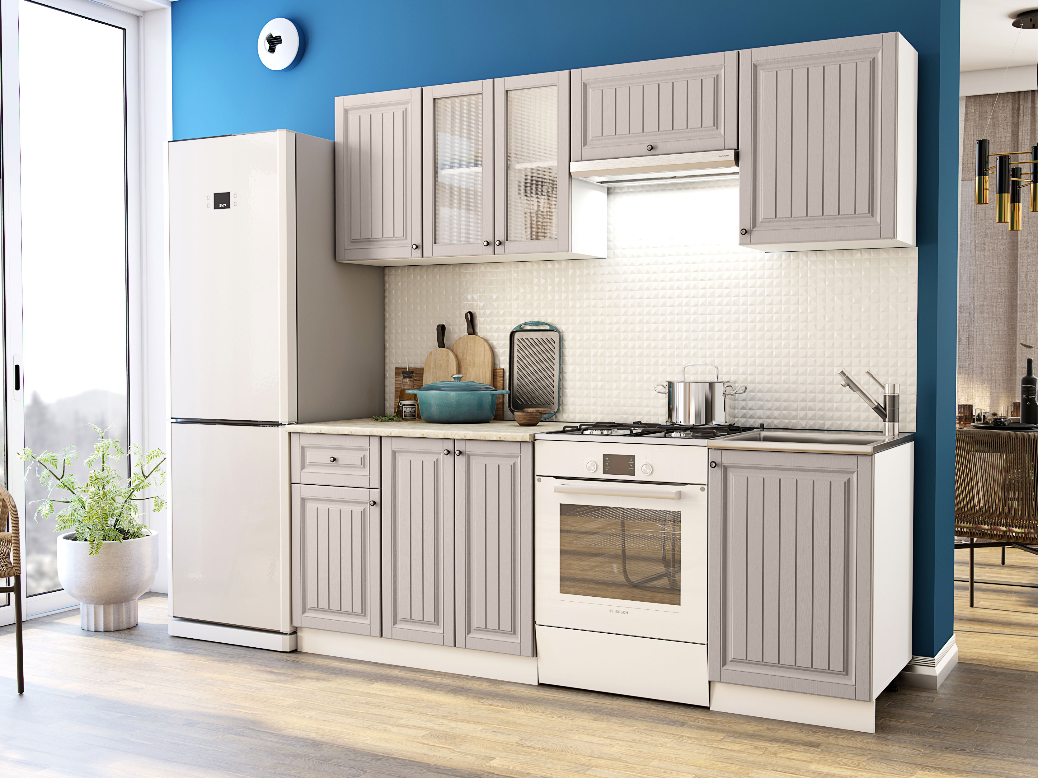 Модульные кухни Хозяюшка помогут обустроить стильное и функциональное пространство, в котором удобно готовить и хранить посуду, разную утварь, сыпучие продукты и специи. Фасады с фрезеровкой и текстурой натурального дерева создают теплую домашнюю атмосферу. Такой дизайн отлично сочетается с разными интерьерными стилями: от классики до прованса.