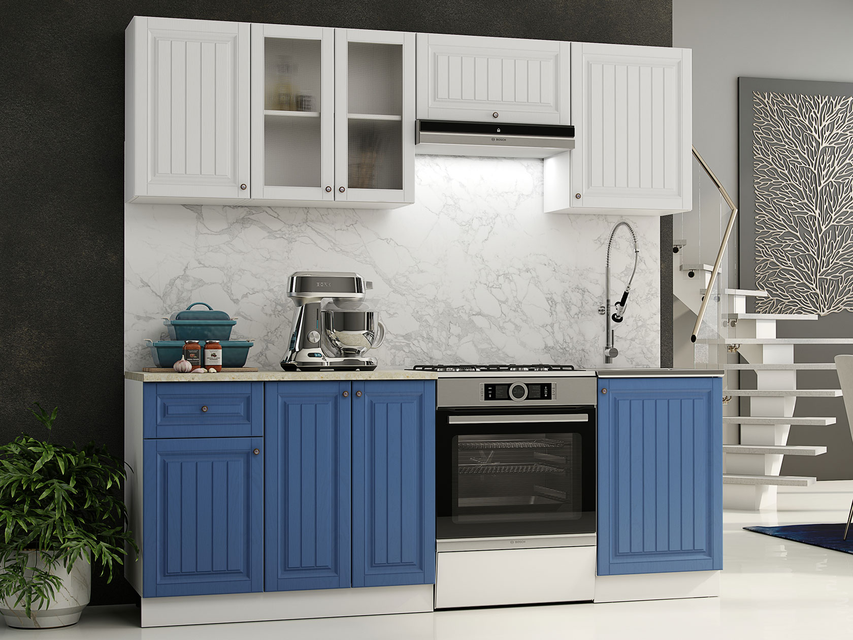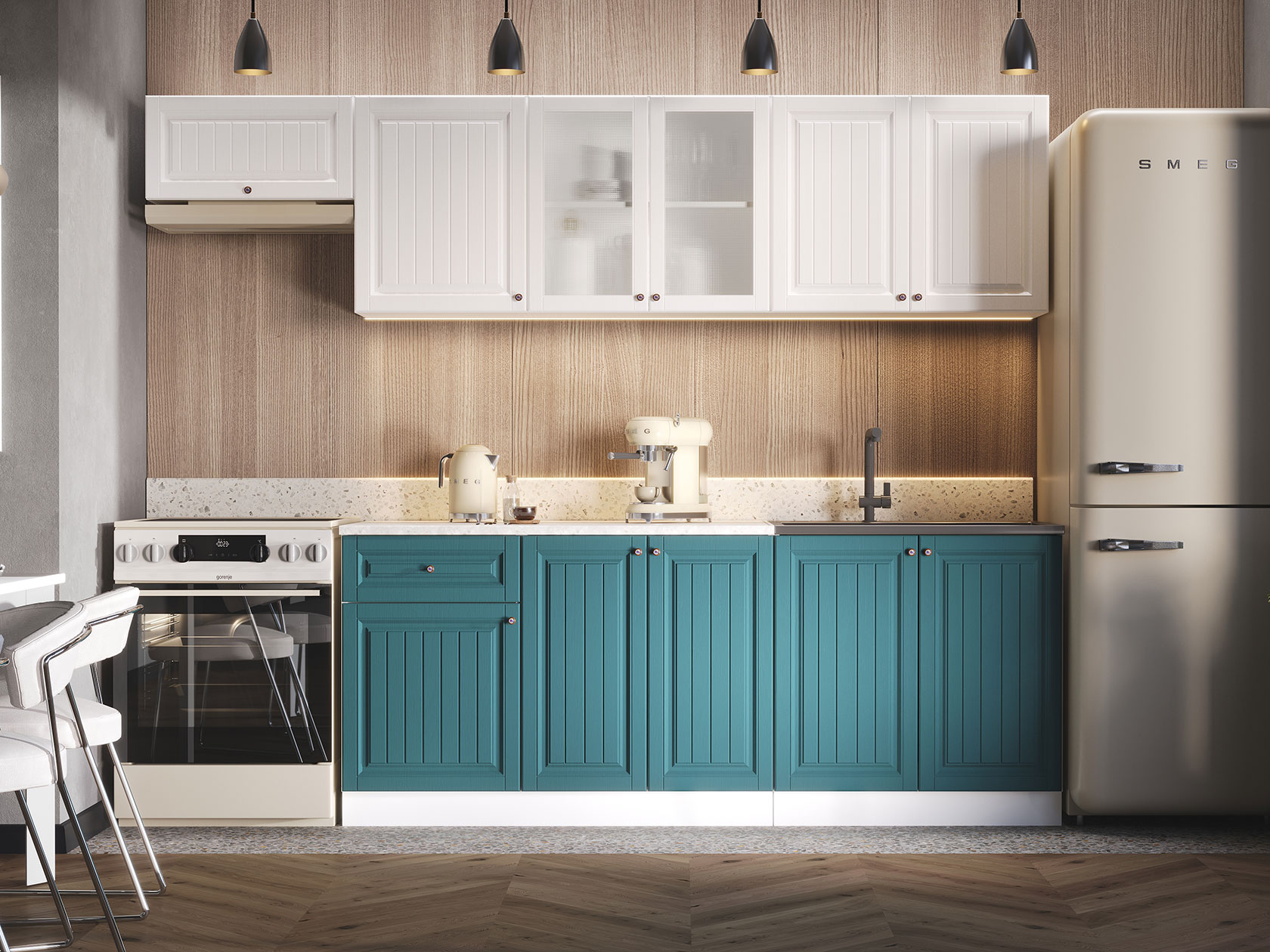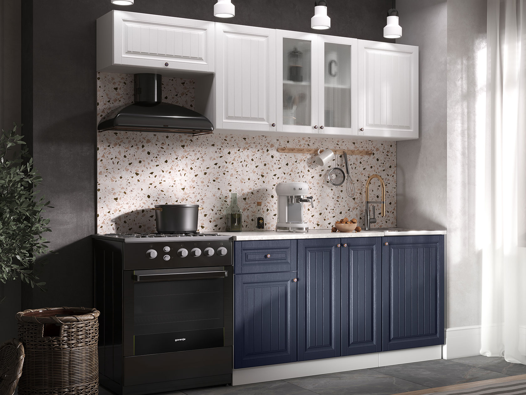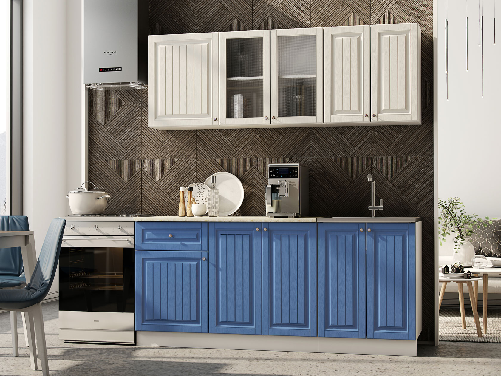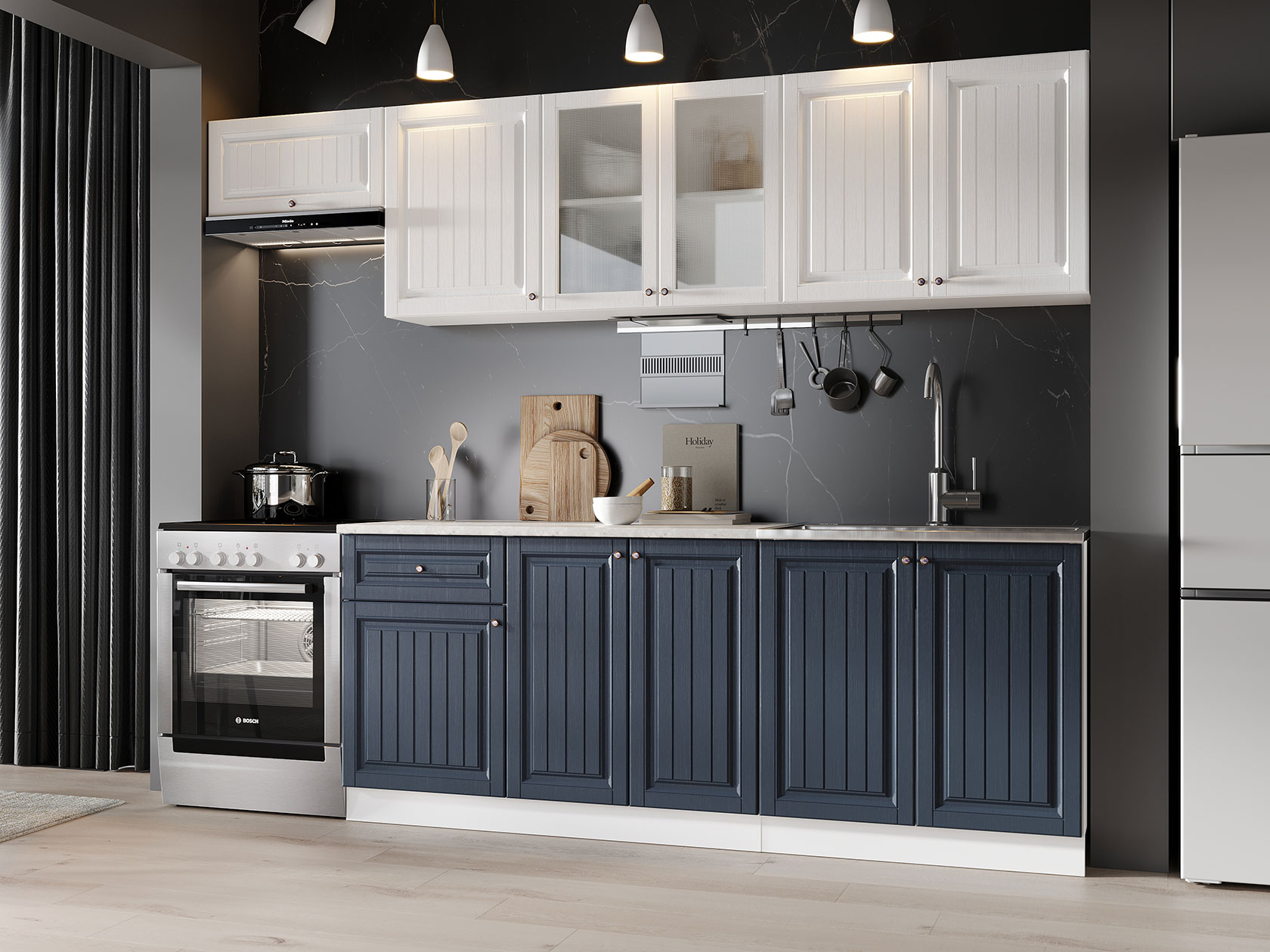 Корпуса модулей выполнены из ЛДСП, фасады — МДФ. Выдвижные ящики оснащены роликовыми направляющими. Опоры регулируются по высоте и закрыты цоколем.