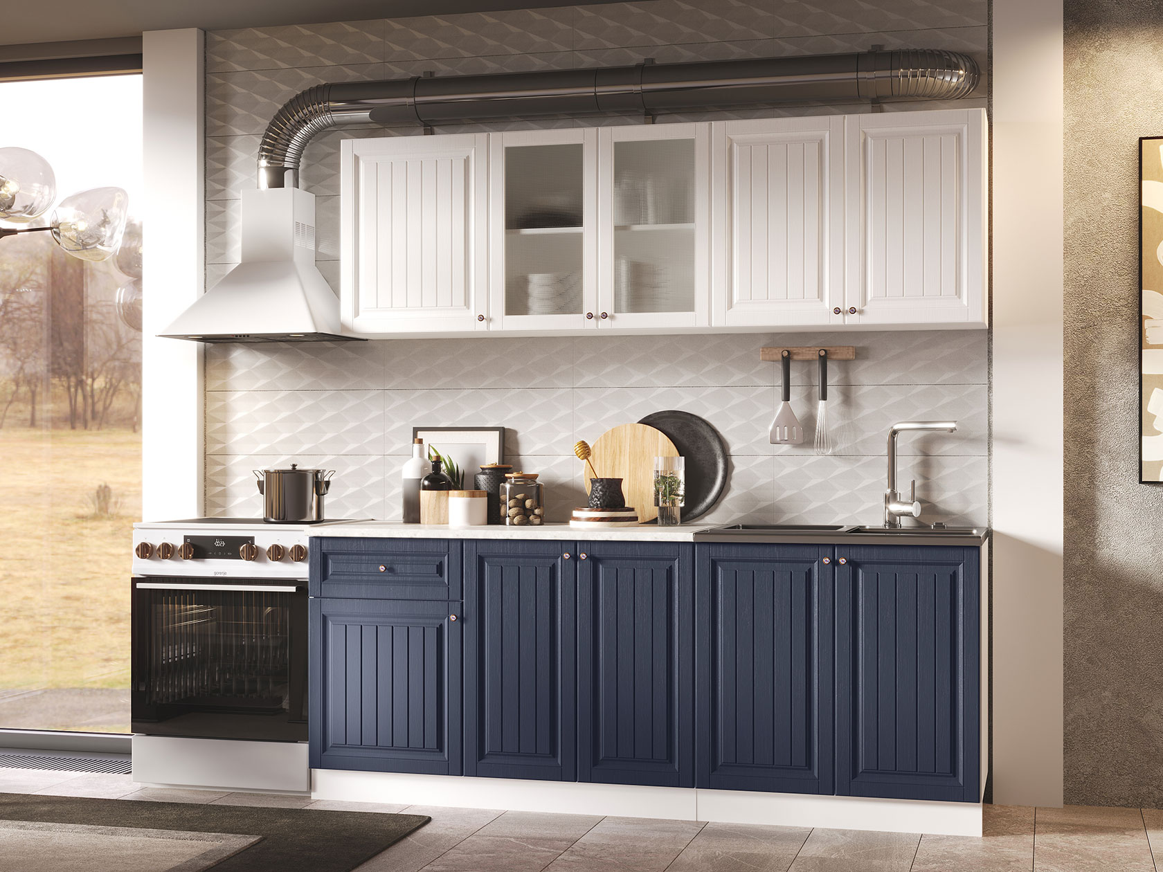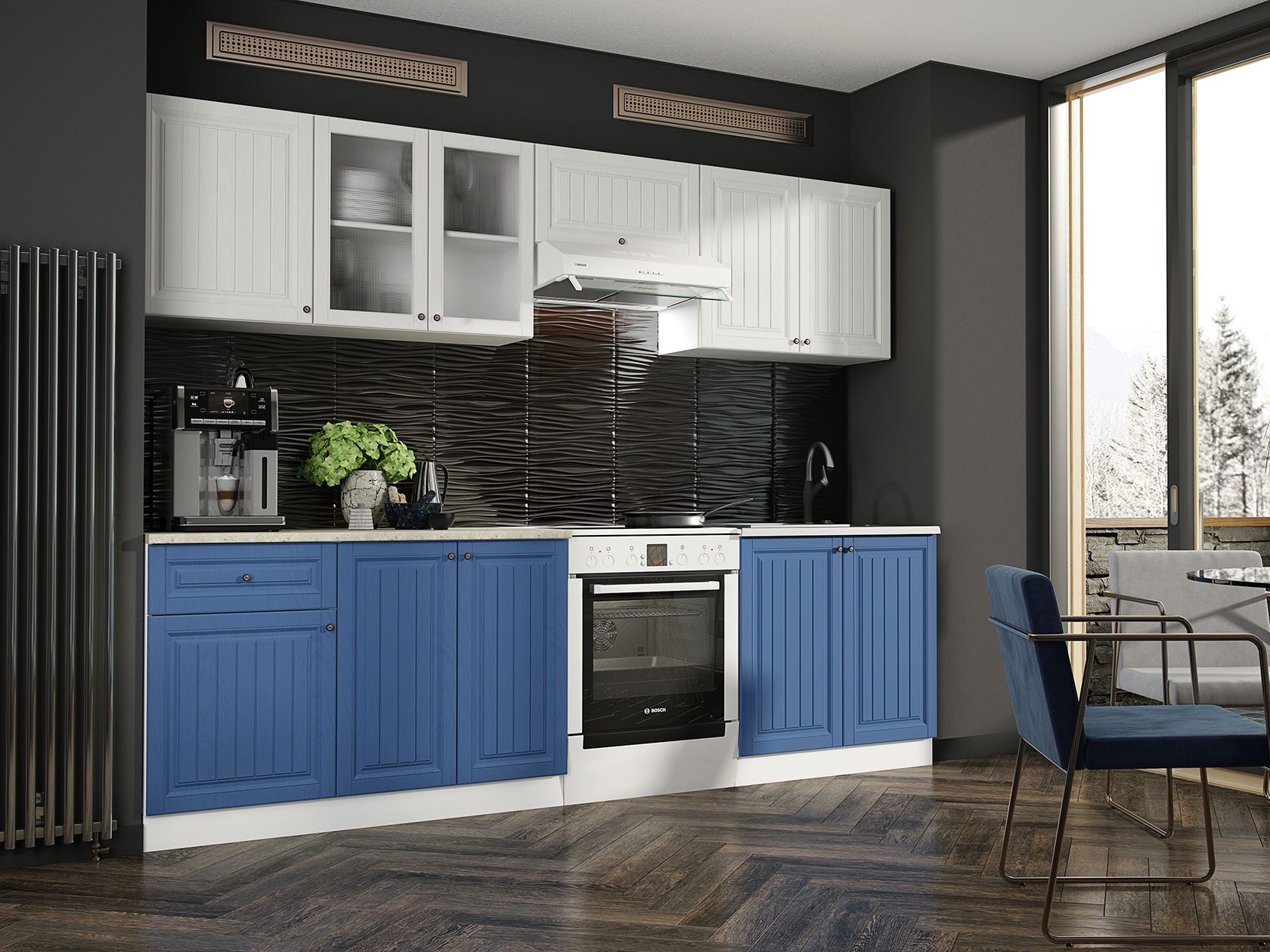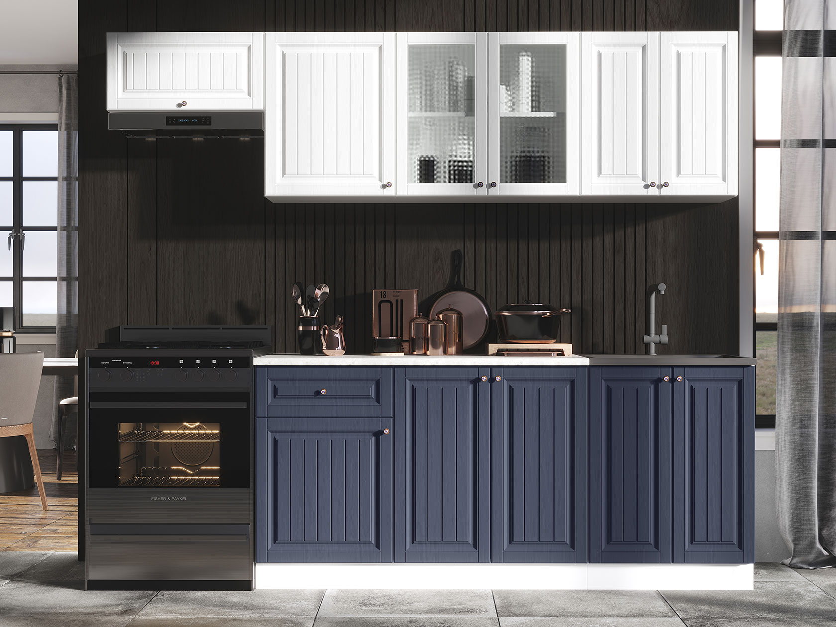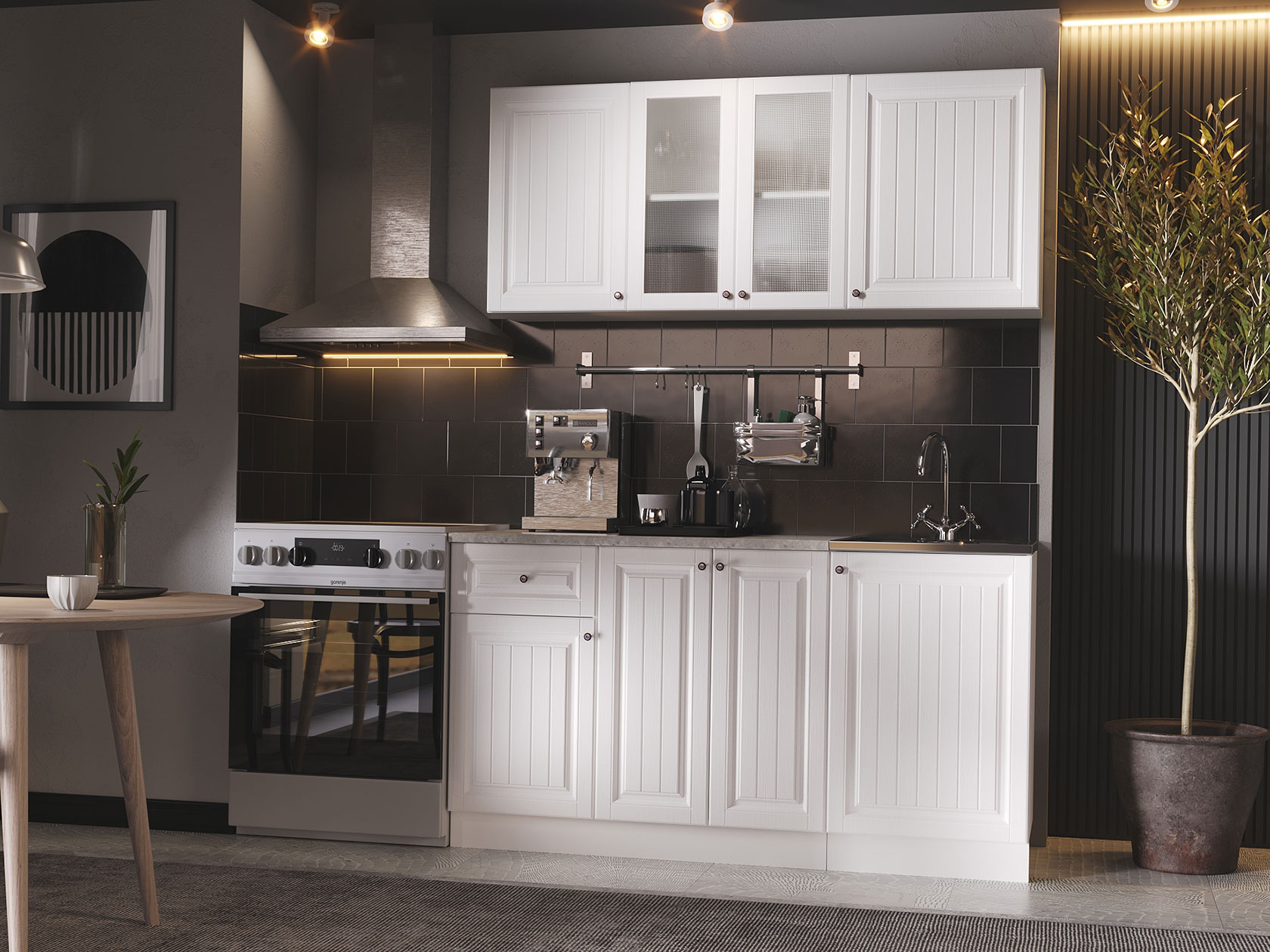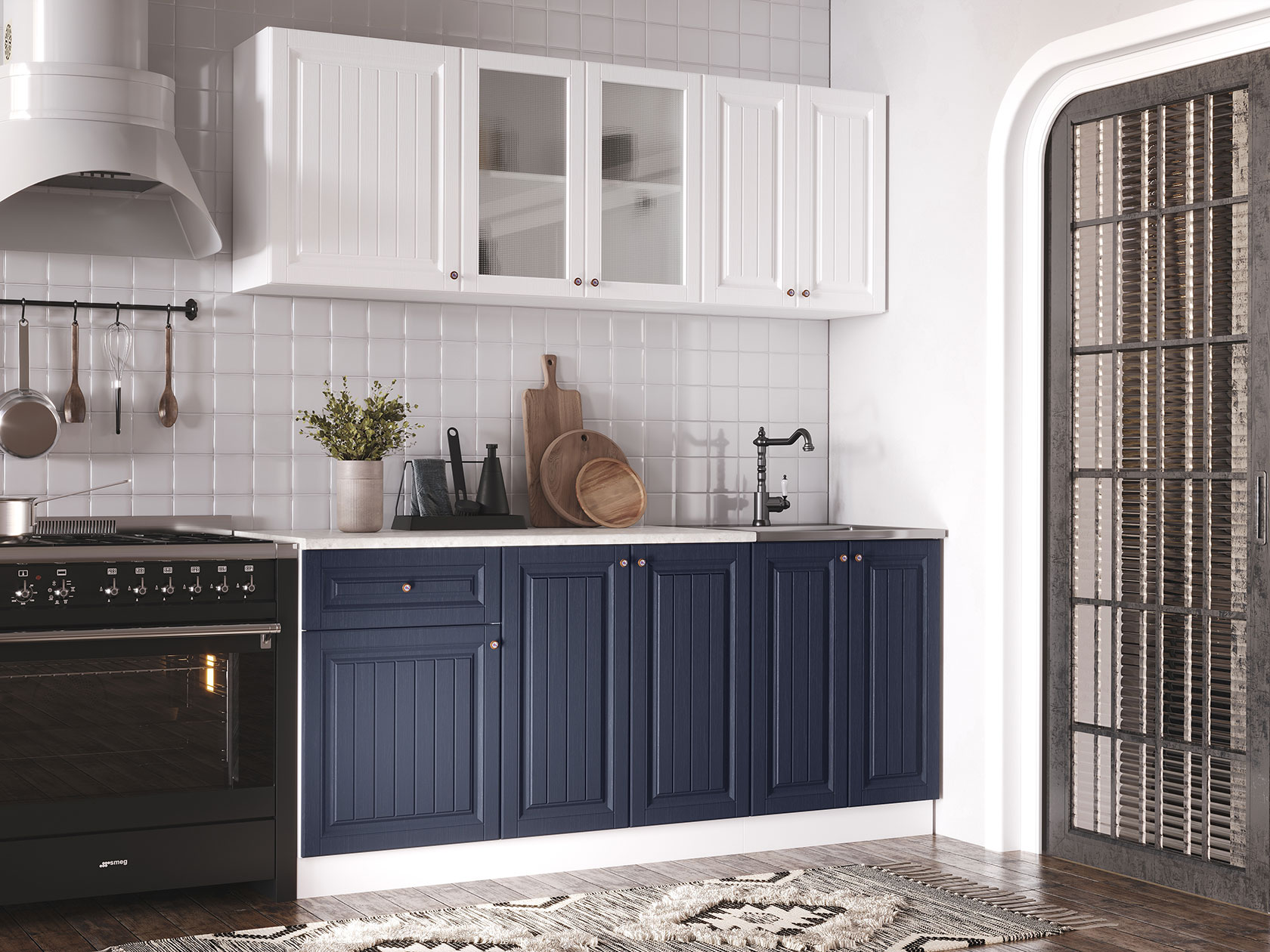 Корпуса модулей выполнены из ЛДСП, фасады — МДФ. Выдвижные ящики оснащены роликовыми направляющими. Опоры регулируются по высоте и закрыты цоколем.