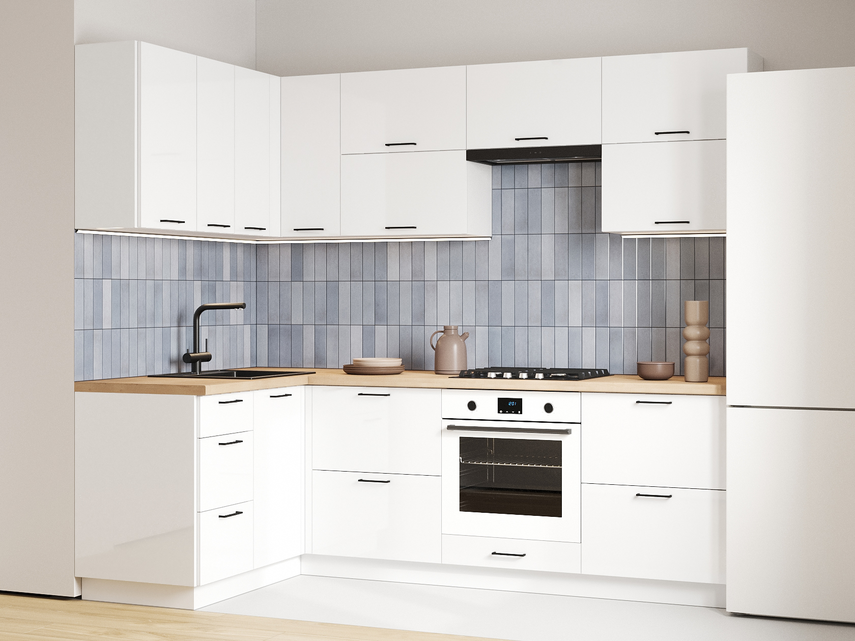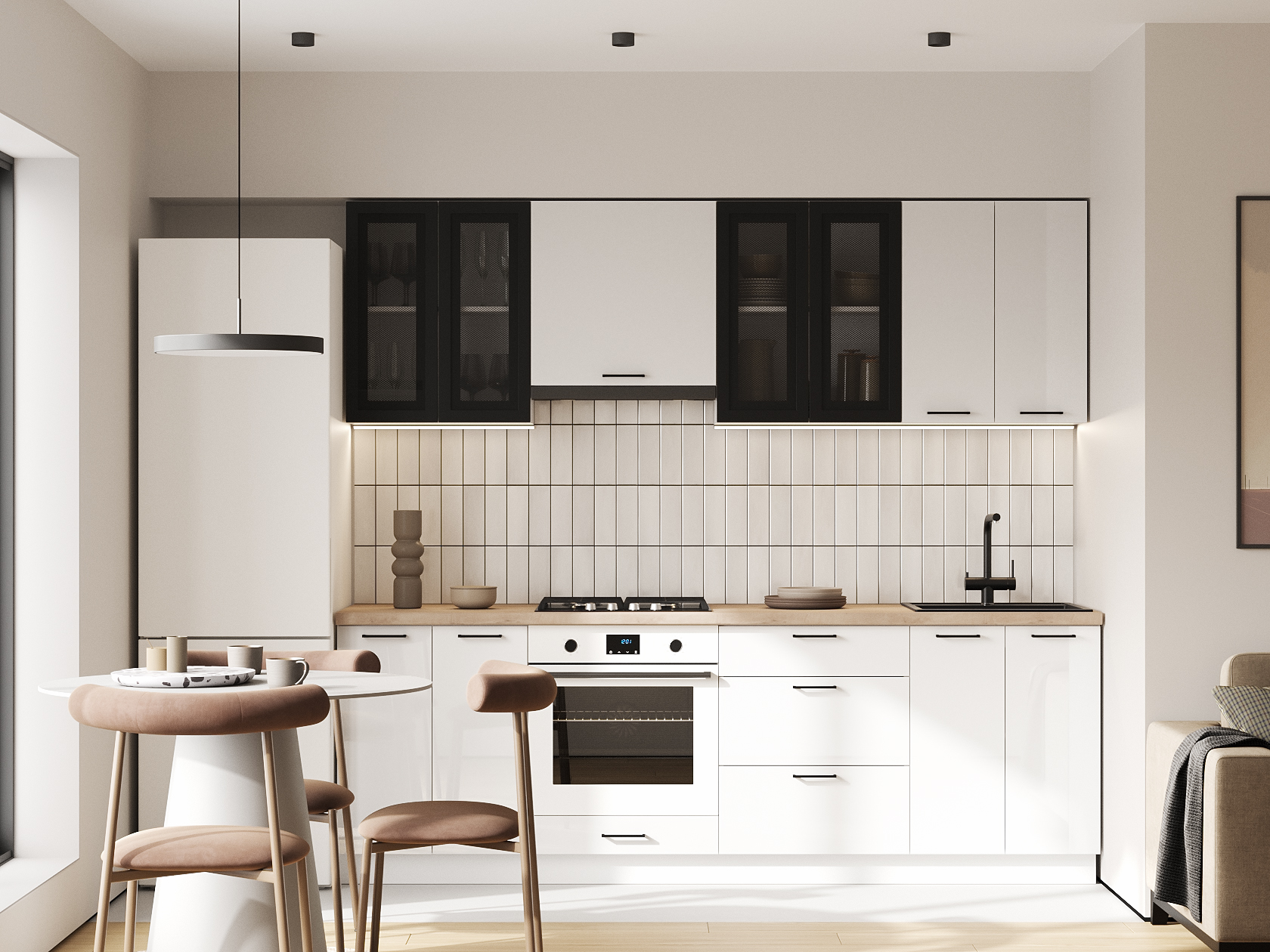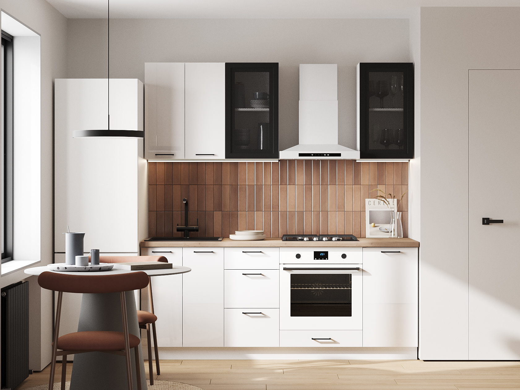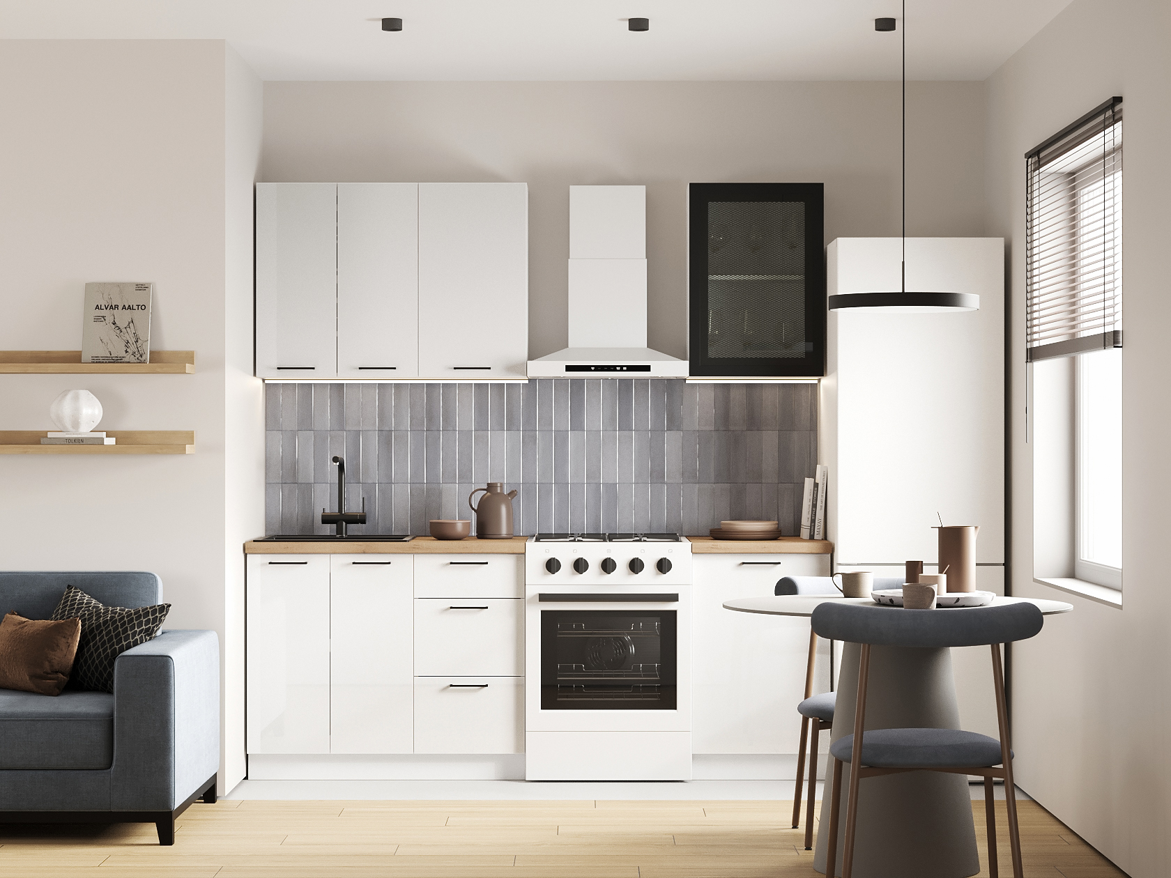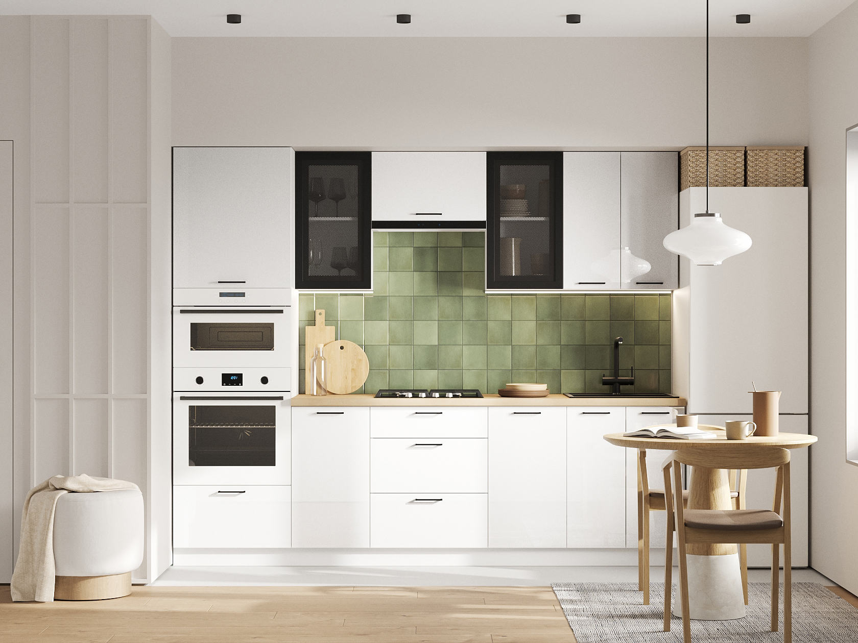 Модульная кухня Стрэйт — практичное и функциональное решение для современного интерьера. Глянцевые фасады в минималистичном оформлении — визитная карточка коллекции. Облицовочное покрытие состоит из нескольких слоев, которые обеспечивают высокую устойчивость к выгоранию, различным повреждениям, воздействию влаги и высоких температур. С идеально ровной поверхности легко удаляются любые загрязнения, что делает кухню еще комфортнее в эксплуатации.