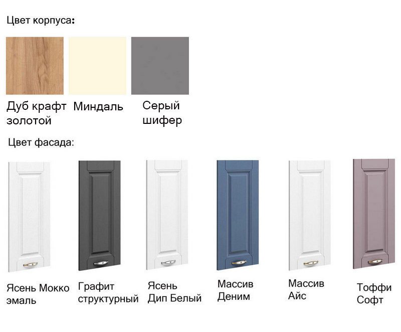 - Цвет фасадов — Ясень Мокко эмаль, Тоффи Софт, Графит структурный, Ясень Дип Белый, Массив Деним, Массив Айс.
