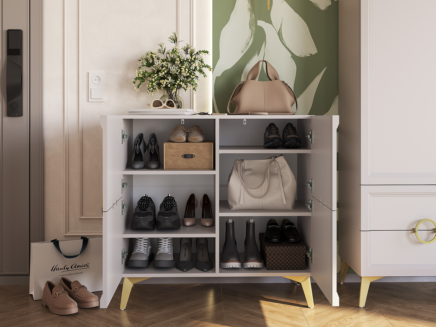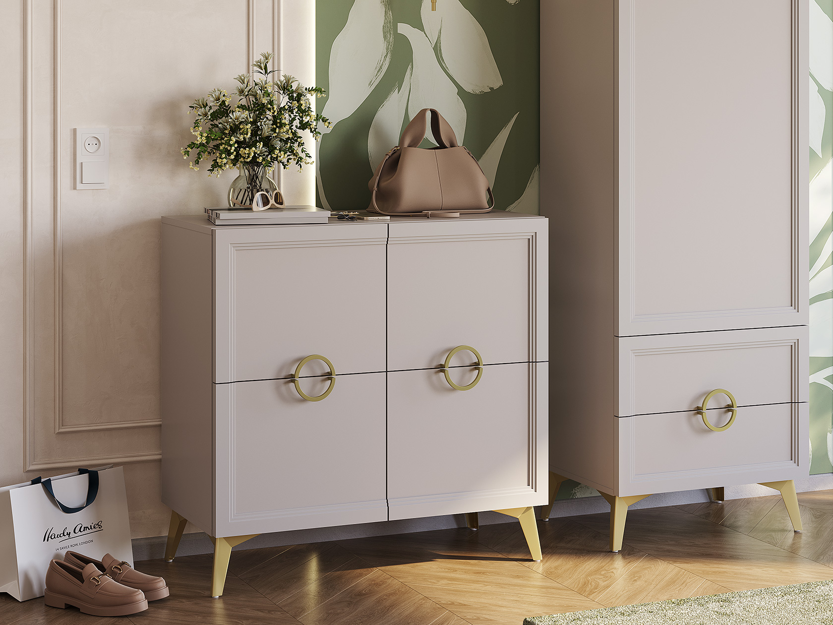 Модульные прихожие Эстетика сочетают элегантный дизайн и функциональность. Разнообразие мест для хранения позволяет организовать расположение сезонной и верхней одежды, а также обуви и аксессуаров. Фрезеровка на фасадах и оригинальная фурнитура в оттенке золота придают мебели нотки роскоши. Направляющие скрытого монтажа и петли с доводчиком делают эксплуатацию простой и удобной.