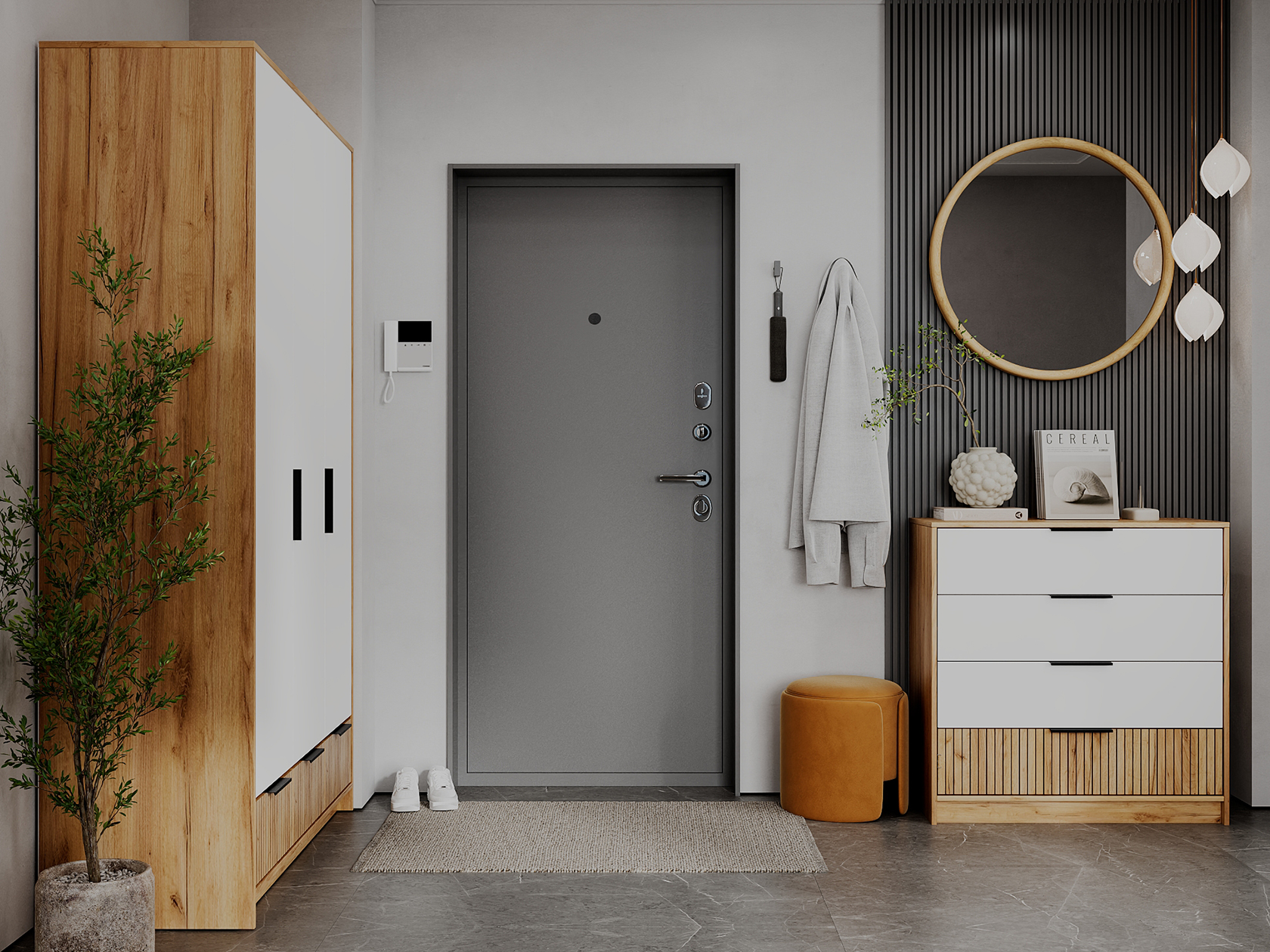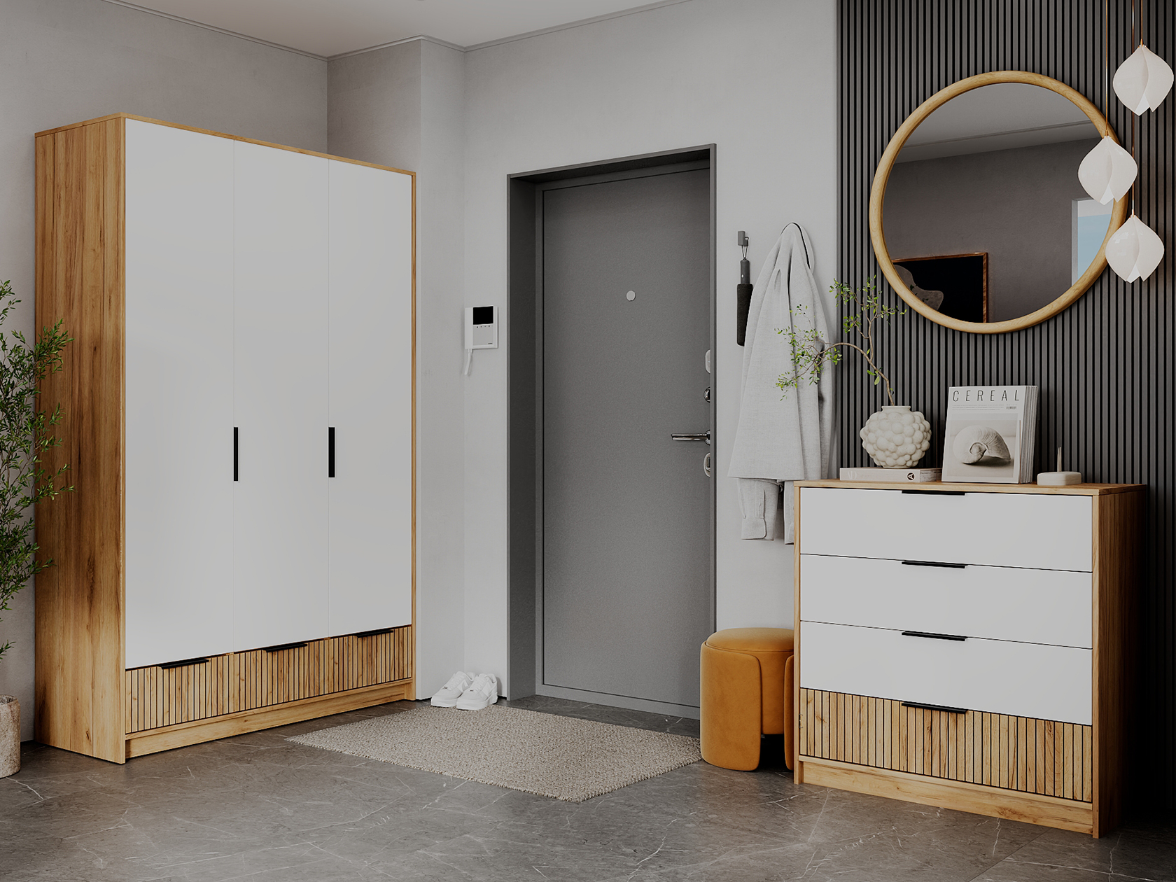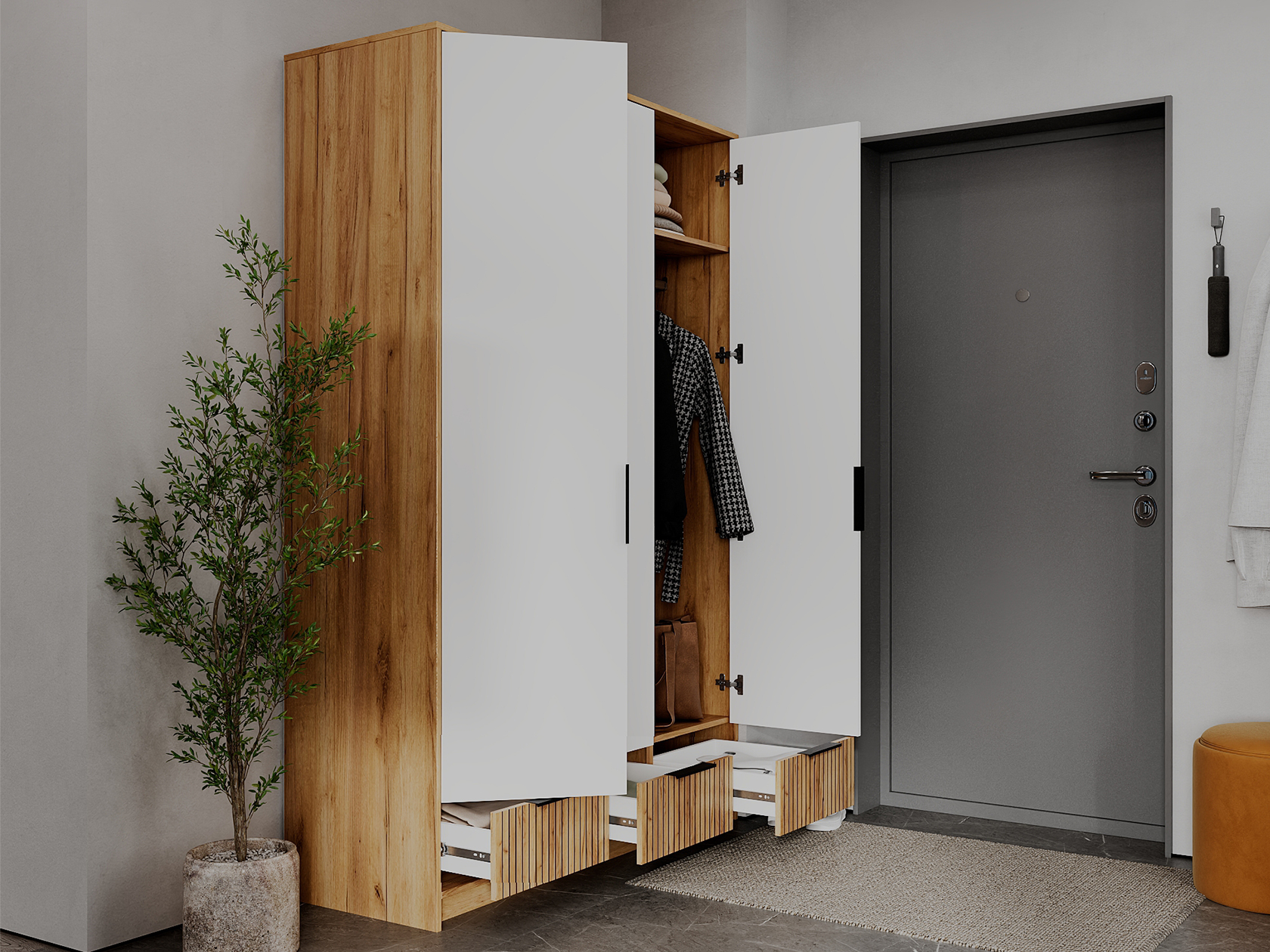 Модульная прихожая Ивис включает функциональные и стильные элементы, которые помогут поддерживать порядок во входной зоне. Матовые фасады с фотопечатью гармонично сочетаются с древесной текстурой. Благодаря качественной фурнитуре пользоваться мебелью комфортно и приятно.