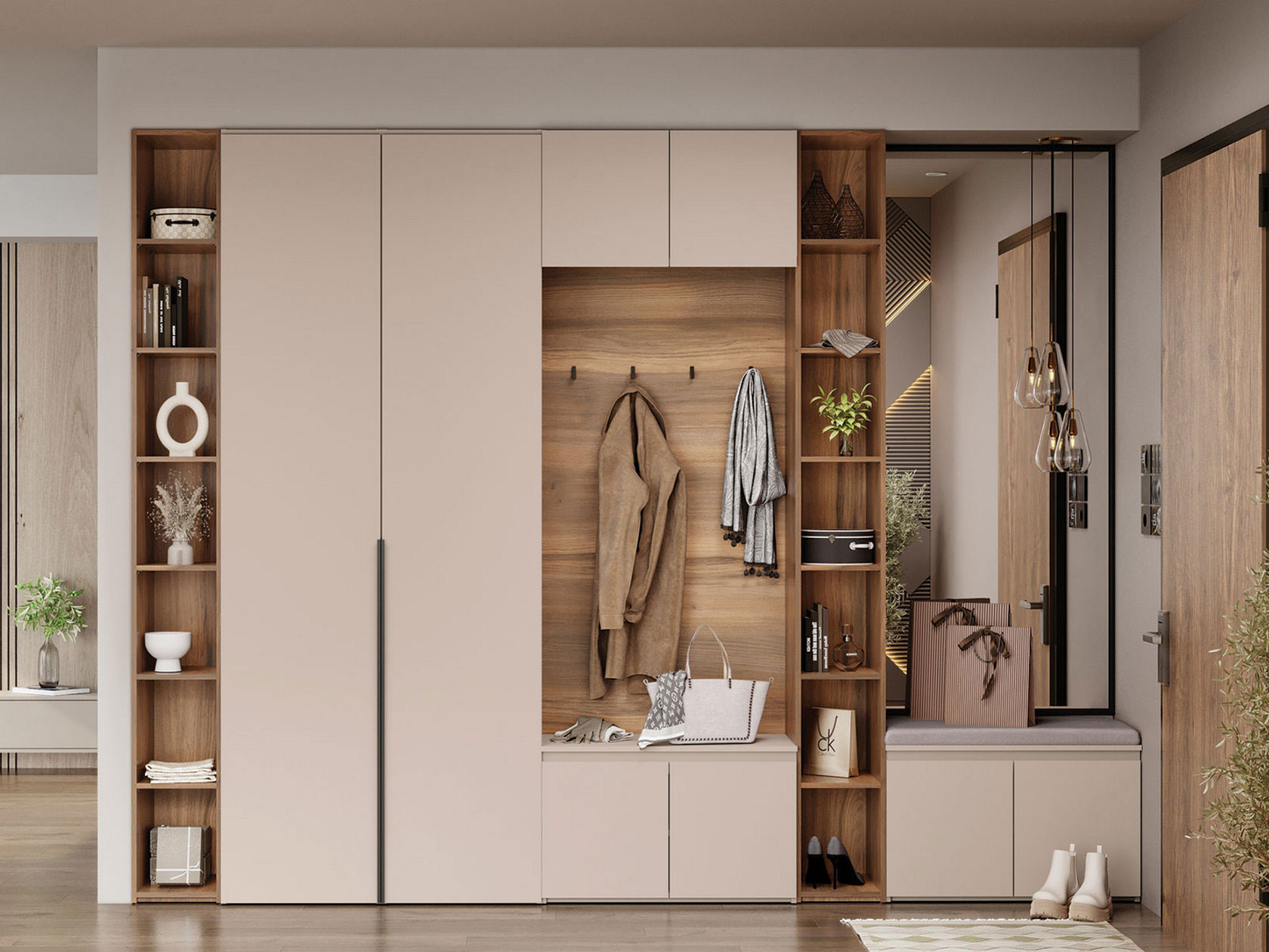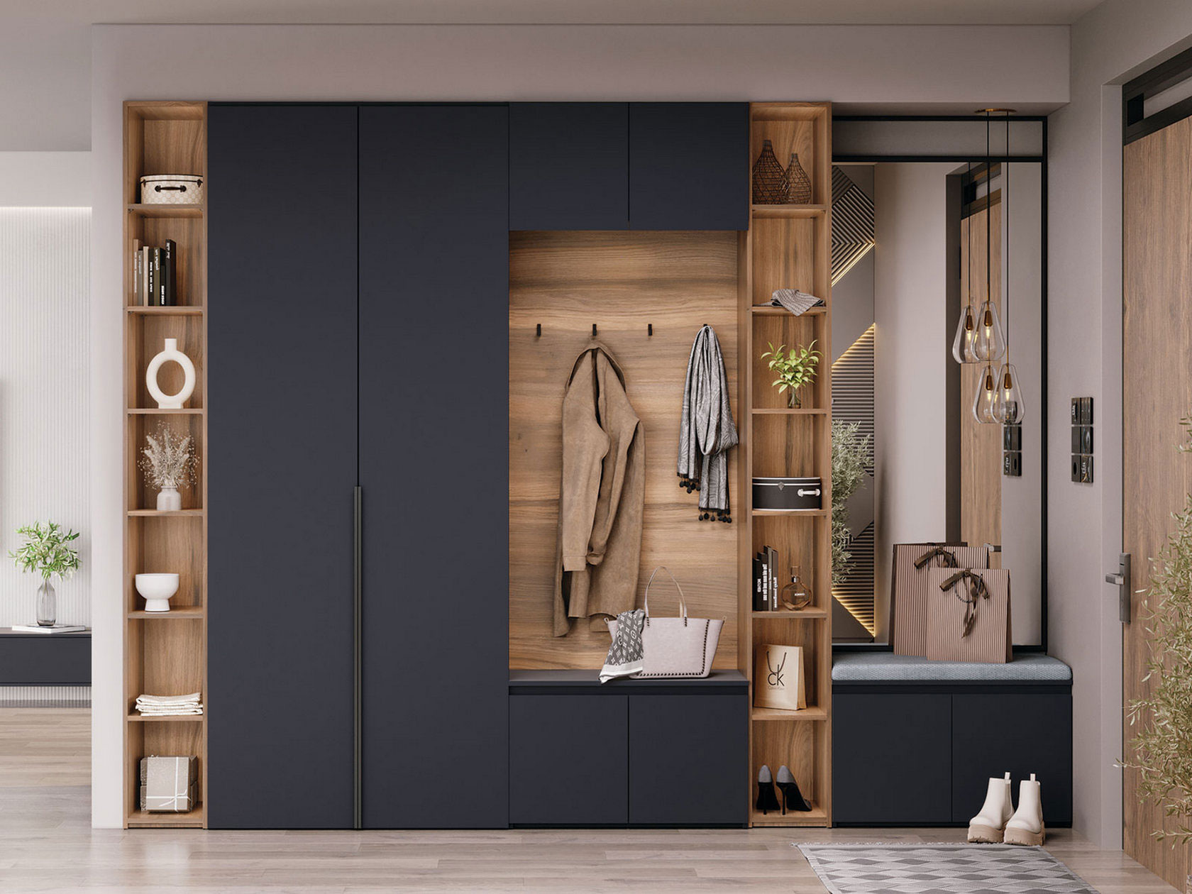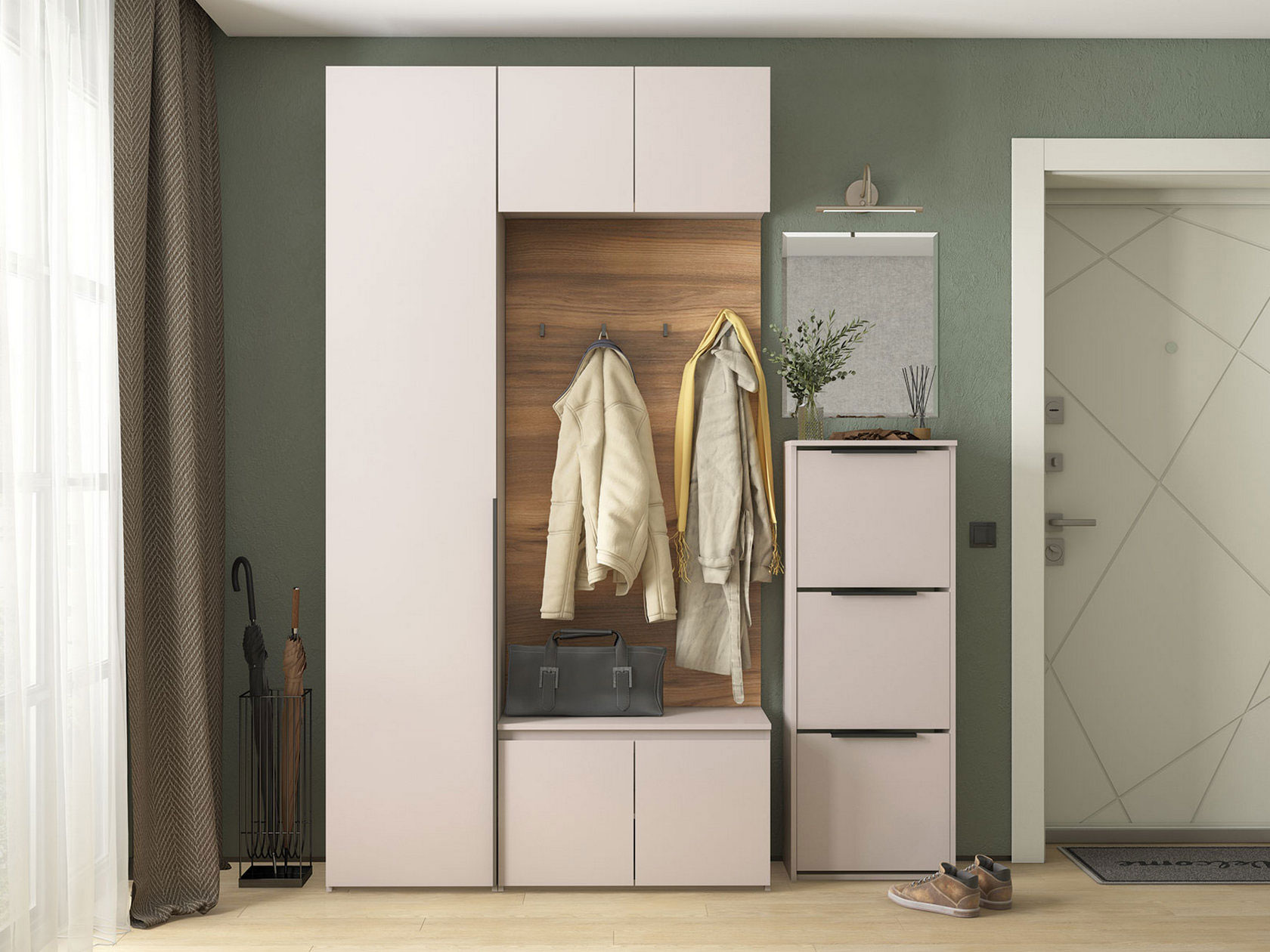 - Особенности С зеркалом, С открытой вешалкой, С антресолями, С распашным шкафом, С сиденьем, Со стеллажом, С местом под ТВ, С комодом, С полками