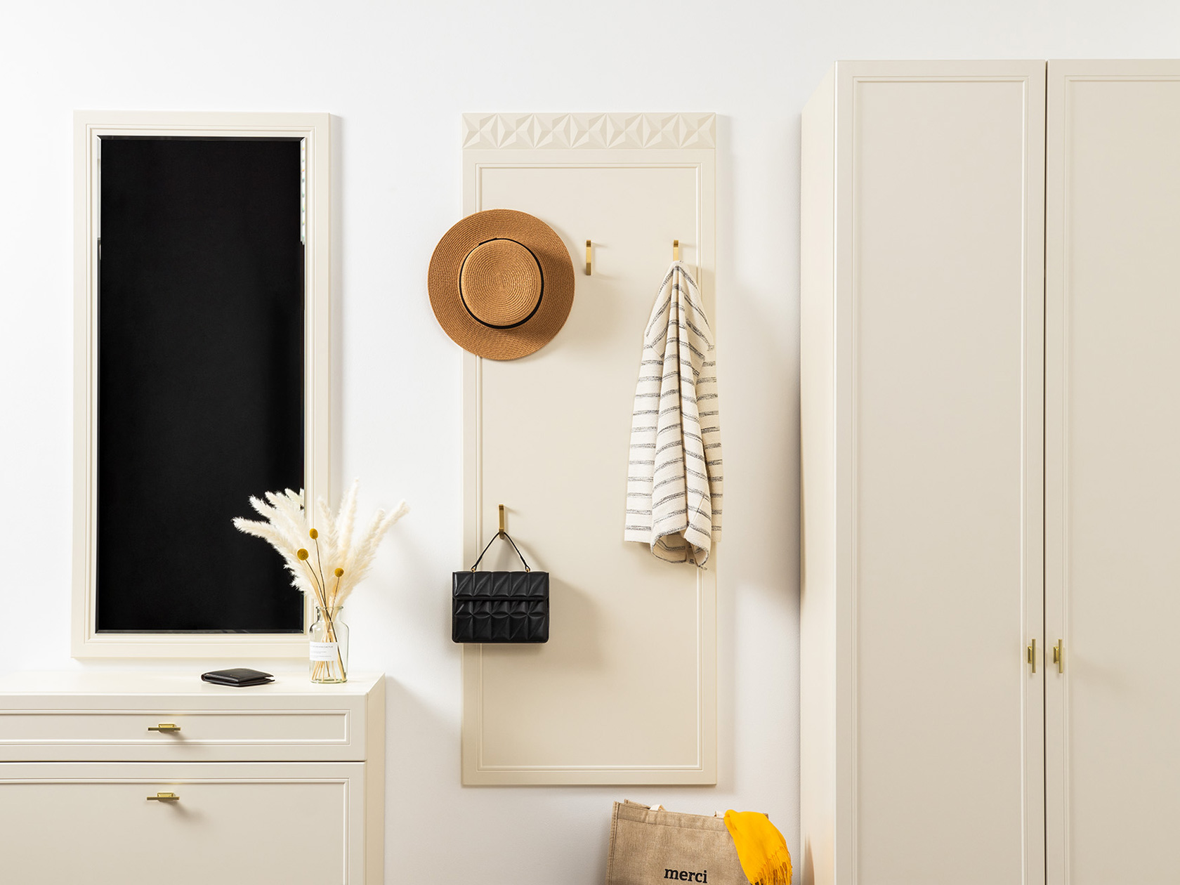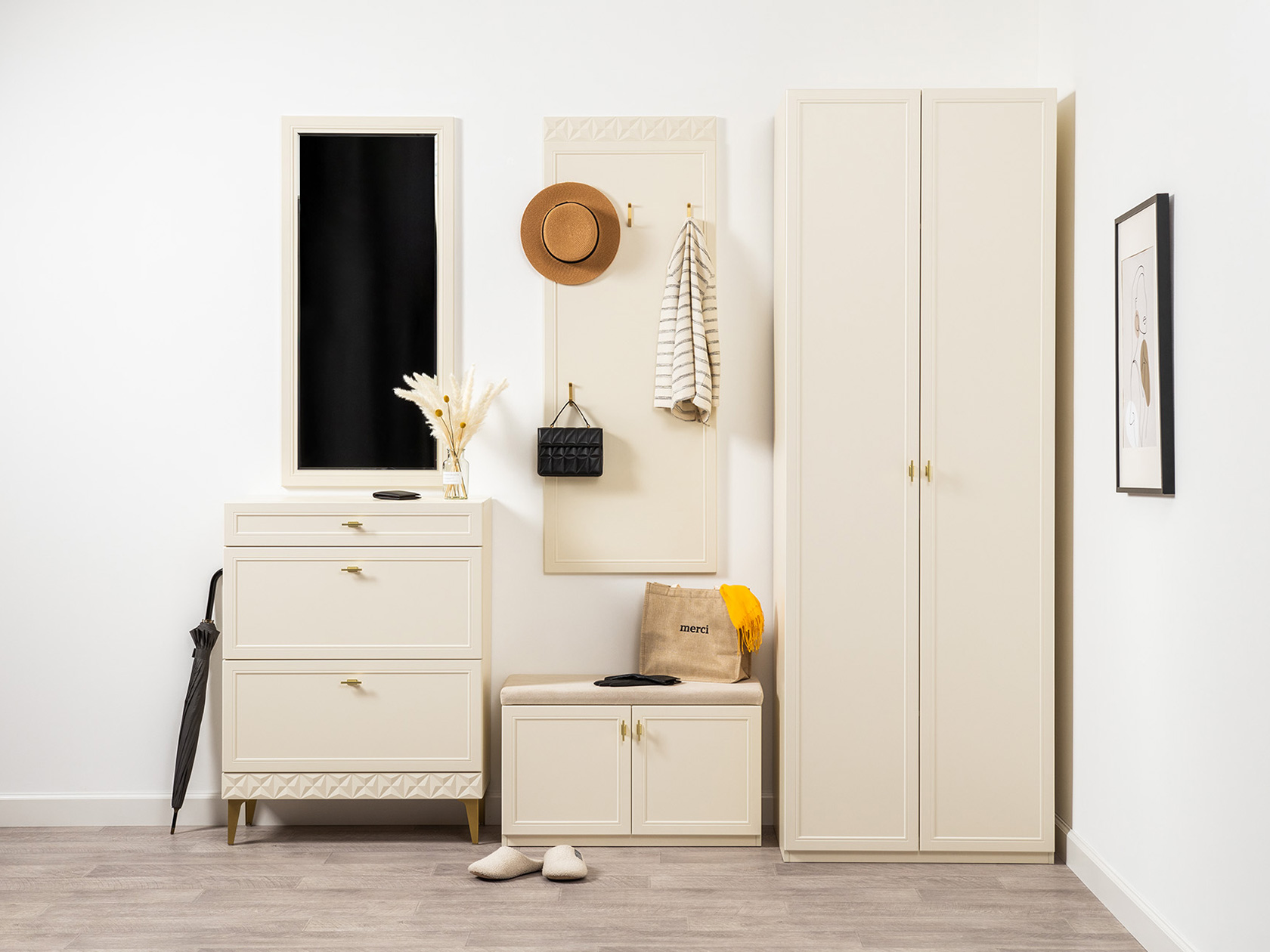 Модульные прихожие Марион — это коллекция, в которой эстетика сочетается с удобным функционалом. Разнообразие мест для хранения позволяет сохранить порядок и аккуратно расположить верхнюю одежду, сезонные вещи, обувь и различные мелочи. Элегантные фасады с рамочной фрезеровкой придают мебели изящество, а высокие ножки и акцентная фурнитура выступают интересными деталями интерьера.