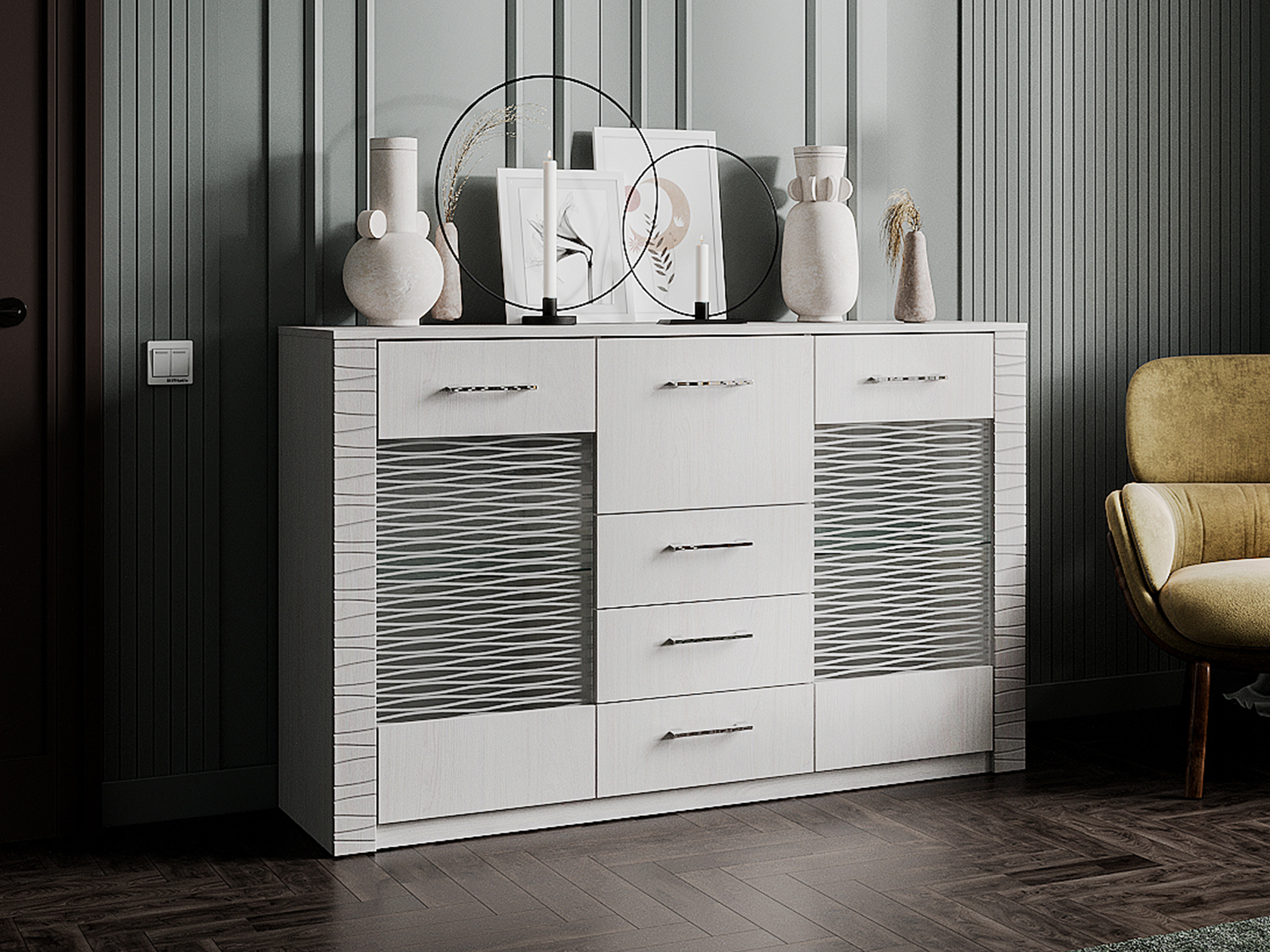 Мебель выполнена из ЛДСП и МДФ 16 мм. Материал ручек — пластик. Выдвижные ящики оснащены роликовыми направляющими.
