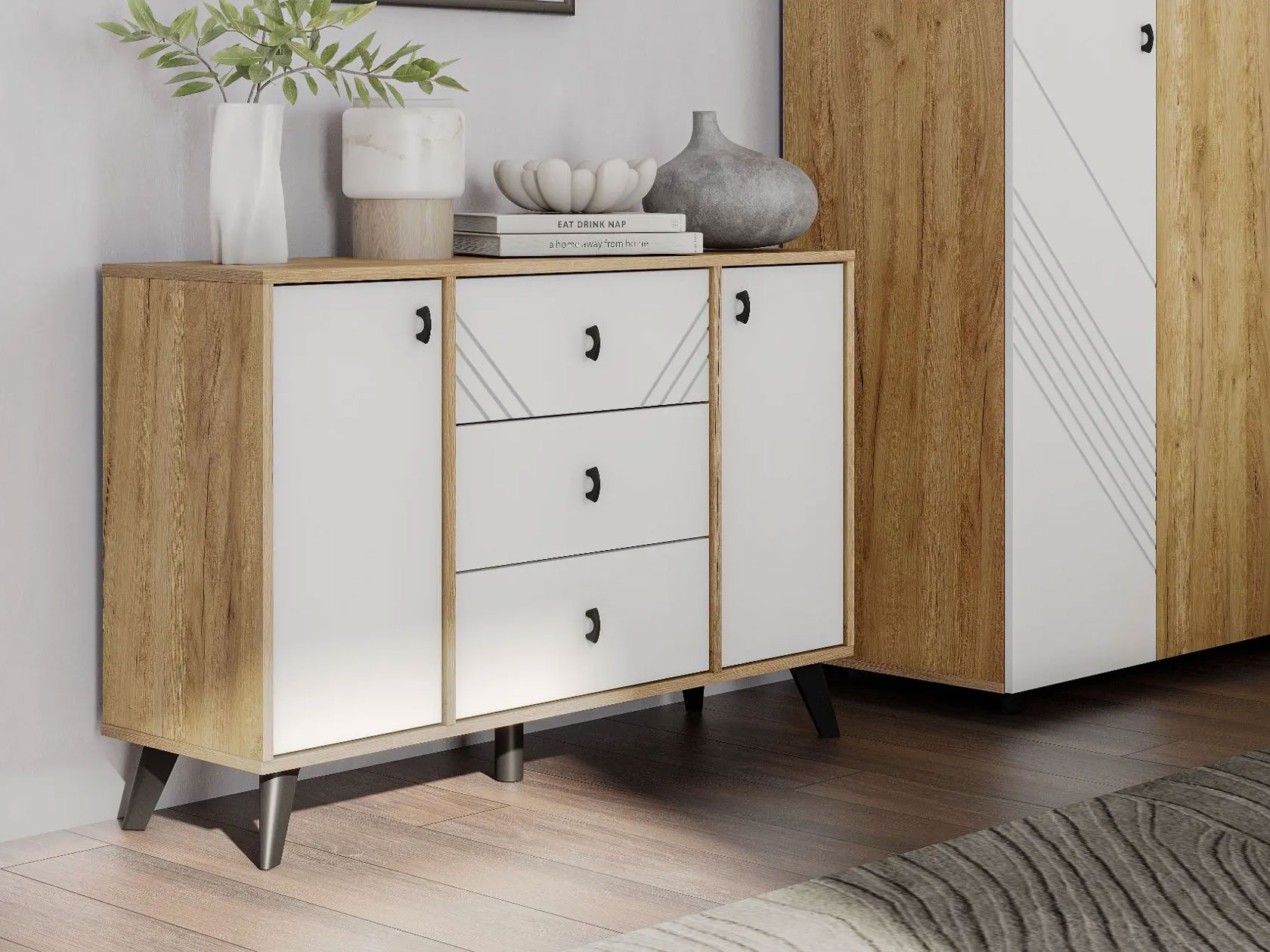 Модульная спальня Кайло поможет создать спокойную и гармоничную обстановку, где будет приятно отдыхать от повседневных забот. В дизайне сделан акцент на сочетание матовых поверхностей и древесной текстуры. Мебель смотрится очень уютно и визуально легко, при этом позволяет удобно разместить все необходимые вещи.
