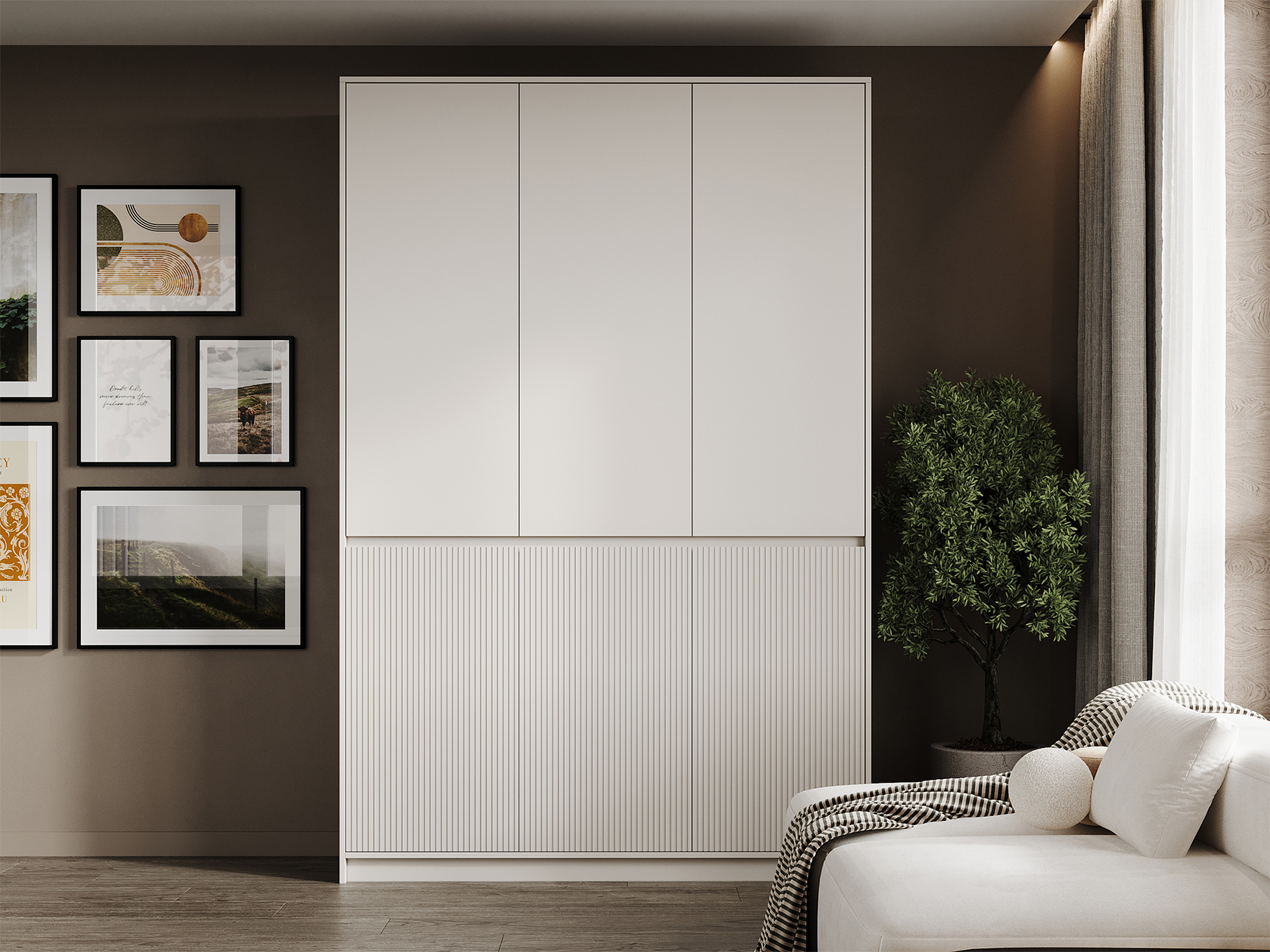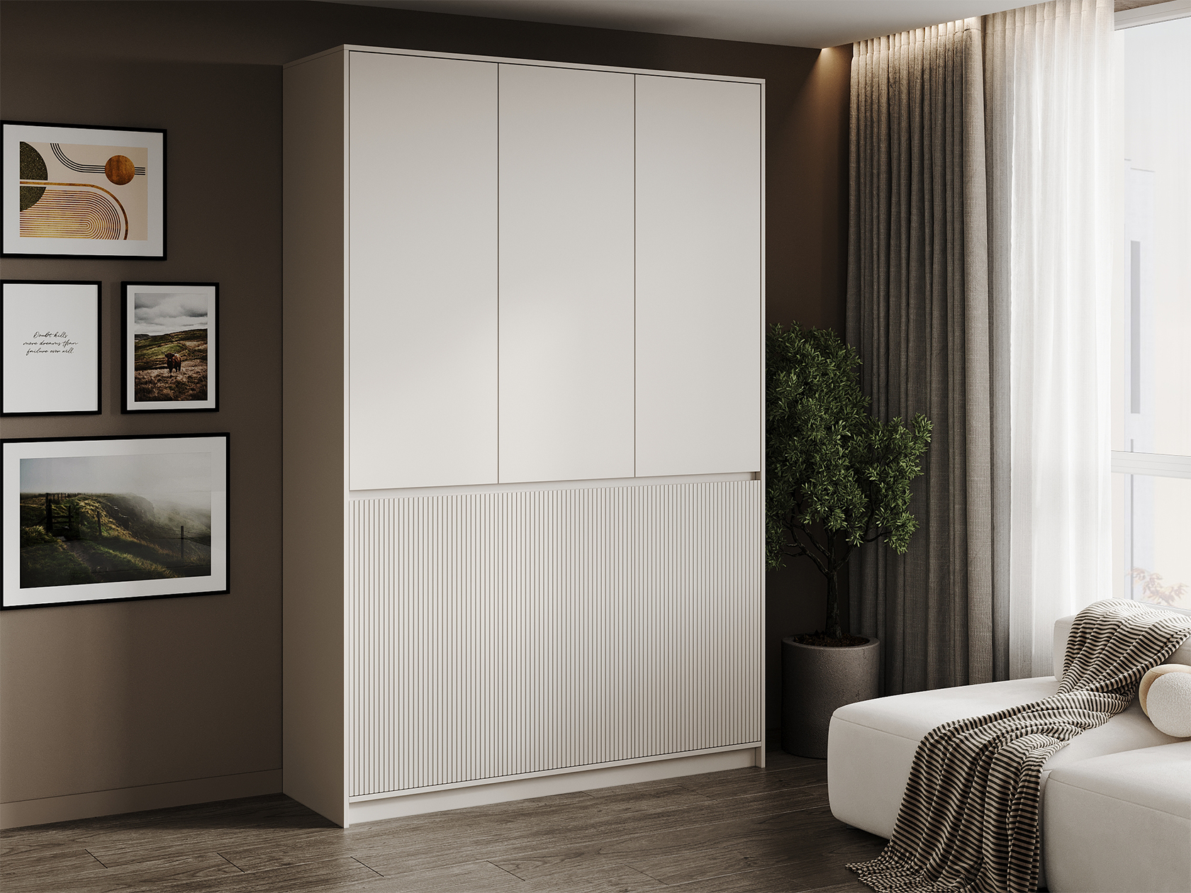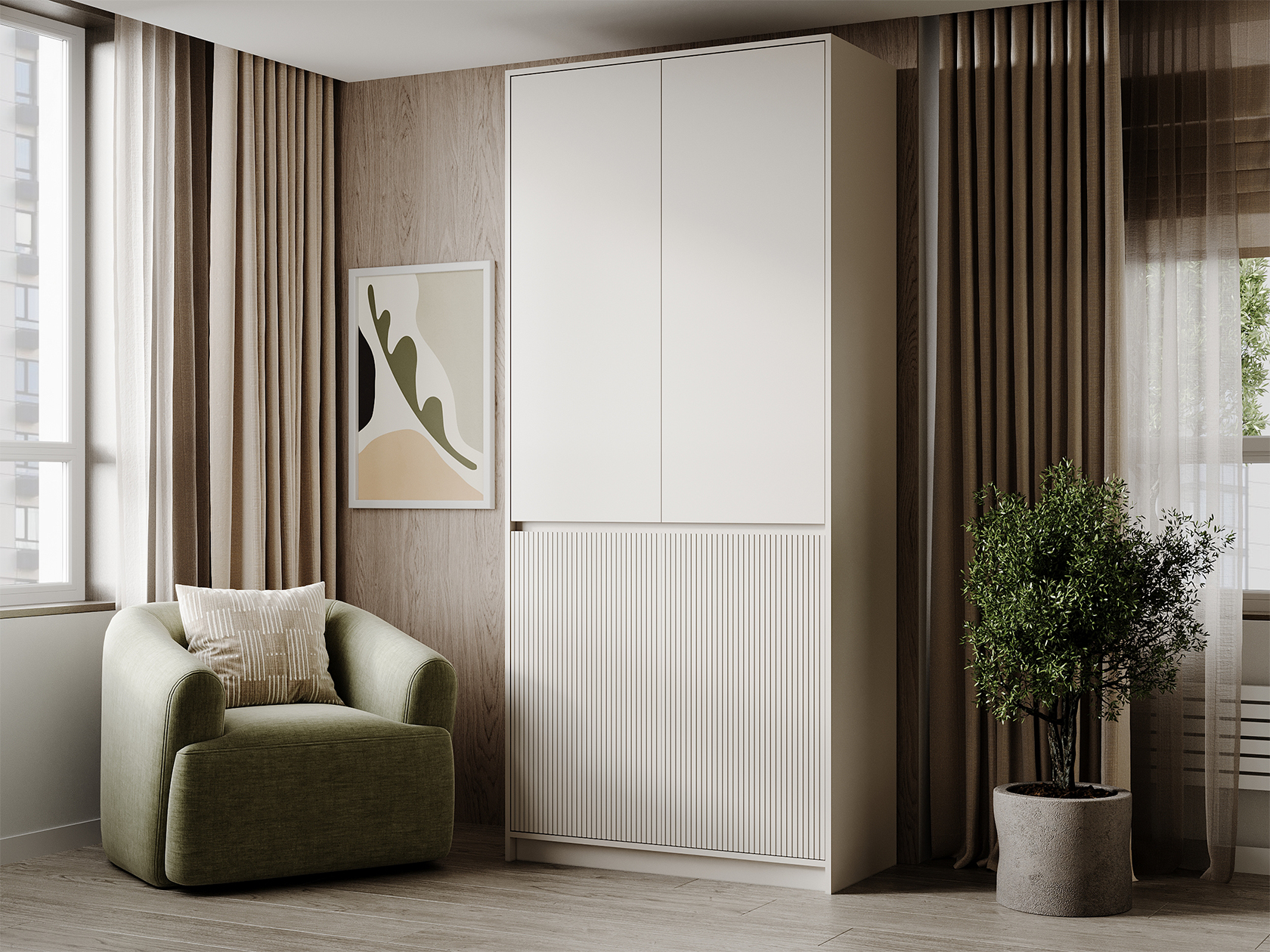 Модульная спальня Мирен — интерьерная система, которая превращает комнату в оазис визуального спокойствия. Мебель различной конфигурации позволяет организовать функциональную зону хранения, где каждая вещь будет на своем месте. Вертикальная волнообразная фрезеровка и специальные выемки вместо ручек служат лаконичными акцентами, при этом сохраняют чистоту линий.