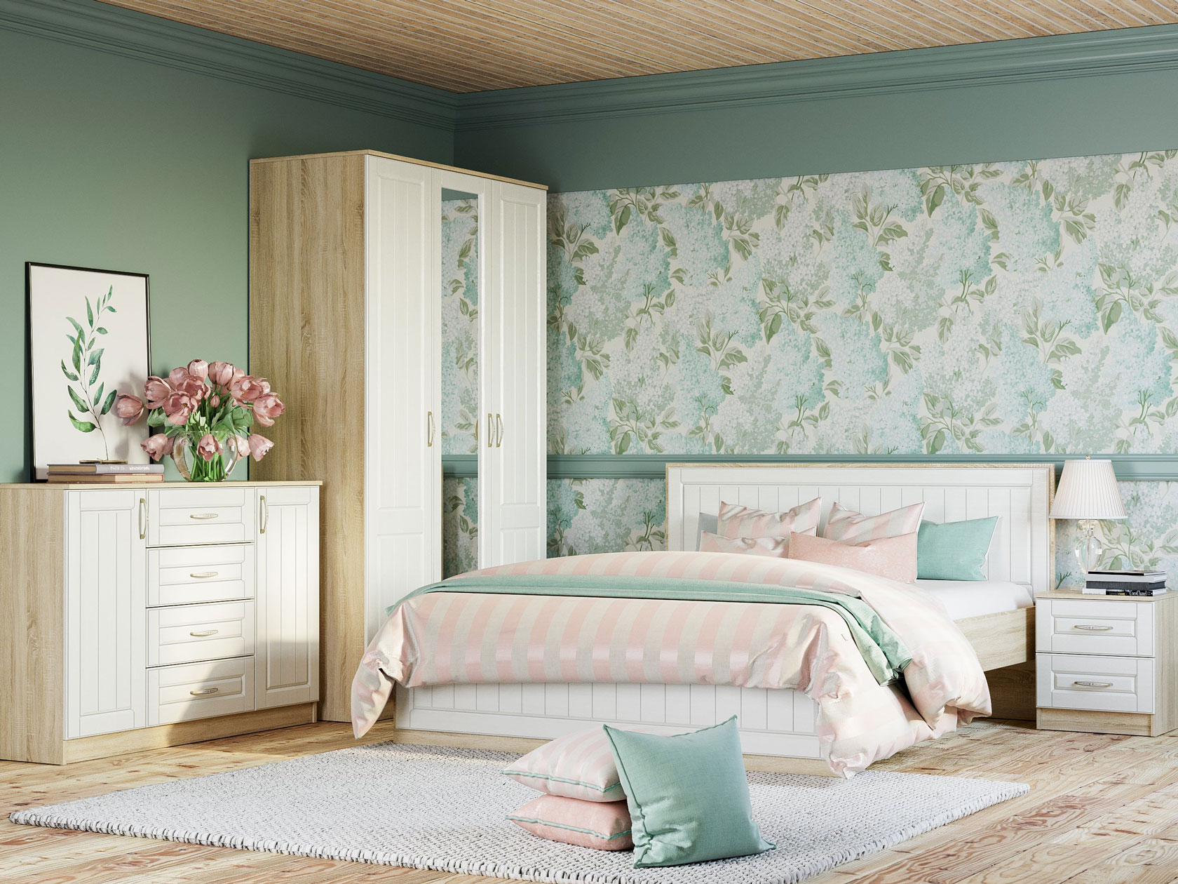 Модульные спальни Оливия Лайт — это тандем эстетичности и функциональности. Светлые фасады с изящными ручками гармонично сочетаются с каркасами под цвет натурального дерева.