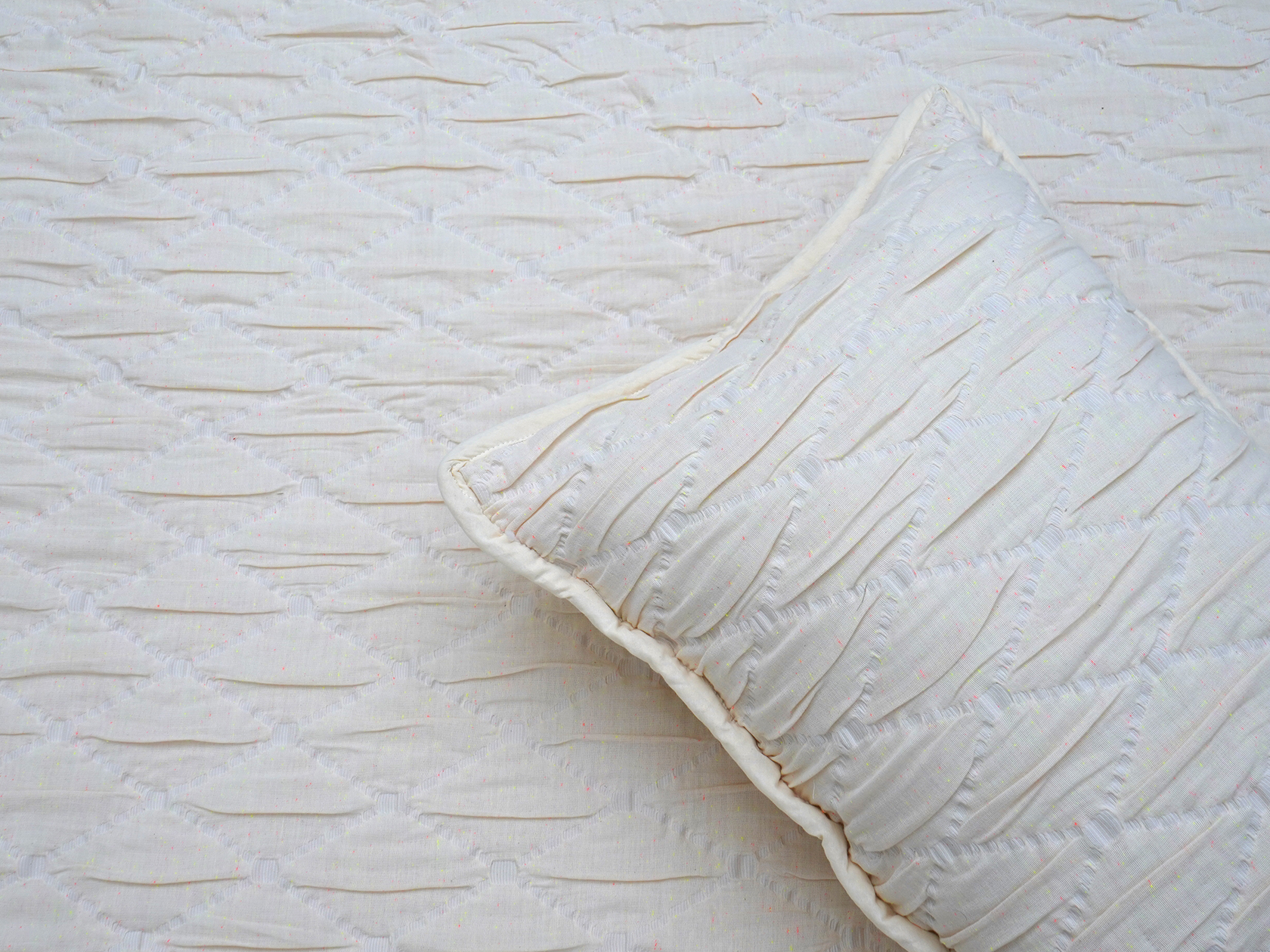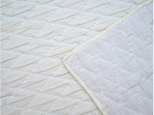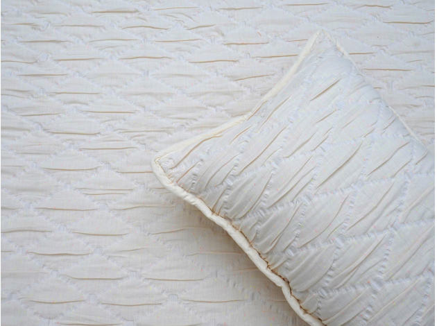 Комплект Самир состоит из стеганого покрывала и двух чехлов для подушек. Лицевая и оборотная стороны выполнены из хлопка, который обеспечивает мягкость и комфорт в любое время года. Наполнитель придает ткани легкость, сохраняет тепло зимой, а летом — дарит приятную прохладу. Универсальный светлый цвет подходит под любой интерьер.