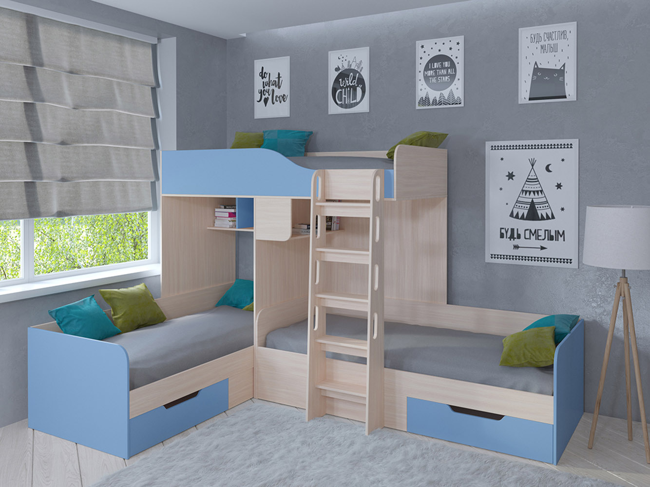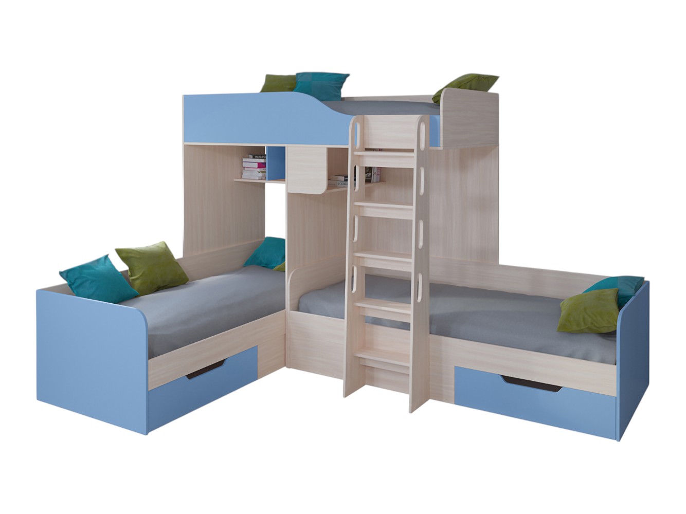 Двухъярусная кровать Трио Дуб Молочный / Голубой