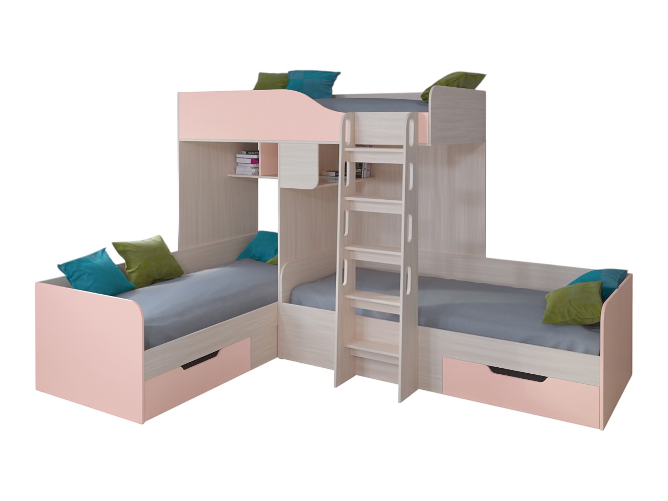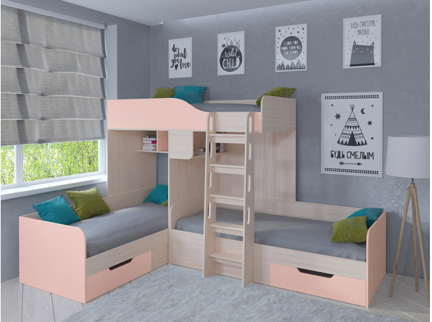 Двухъярусная кровать Трио Дуб Молочный / Розовый