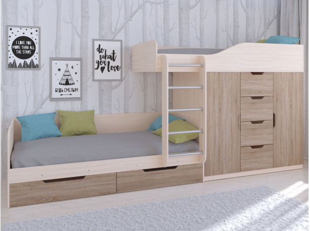 Под верхней кроватью продумана система хранения вещей и одежды, состоящая из четырех выдвижных ящиков по центру и двух распашных шкафов: в одном есть полки, во втором — штанга для вешалок. Так же на сайте есть инструкция.