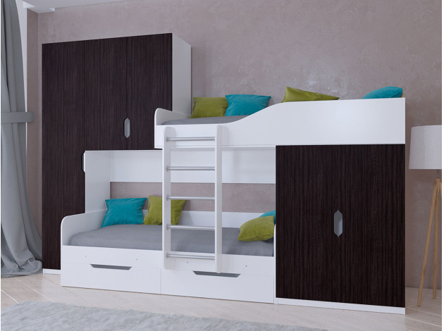 В целом покупкой довольна, вместительные шкафы, хорошее спальное место. Ограждением от случайного падения во время сна на нижней кровати для младшего ребёнка служит лестница, на верхнем ярусе идёт достаточно высокое ограждение от верхней правой части лестницы, при этом матрац всё же лучше брать не более 15 см в высоту. При сборке у мужа возникали некоторые трудности, т.к. указанные в инструкции детали имели другие размеры. Самым неприятным моментом оказался скол на верхней части ограждения второго яруса кровати. Обнаружили его при распаковке, но уже после подписания акта приёма-передачи. Поэтому советую перед подписание акта распаковать все коробки и проверить на целостность все детали.