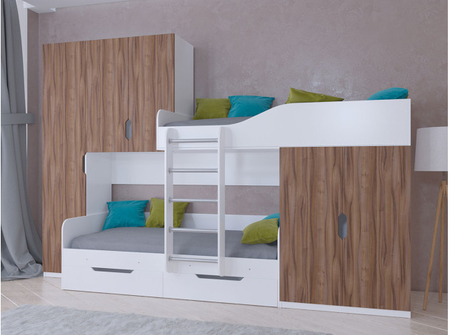 В целом покупкой довольна, вместительные шкафы, хорошее спальное место. Ограждением от случайного падения во время сна на нижней кровати для младшего ребёнка служит лестница, на верхнем ярусе идёт достаточно высокое ограждение от верхней правой части лестницы, при этом матрац всё же лучше брать не более 15 см в высоту. При сборке у мужа возникали некоторые трудности, т.к. указанные в инструкции детали имели другие размеры. Самым неприятным моментом оказался скол на верхней части ограждения второго яруса кровати. Обнаружили его при распаковке, но уже после подписания акта приёма-передачи. Поэтому советую перед подписание акта распаковать все коробки и проверить на целостность все детали.