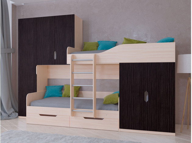 В целом покупкой довольна, вместительные шкафы, хорошее спальное место. Ограждением от случайного падения во время сна на нижней кровати для младшего ребёнка служит лестница, на верхнем ярусе идёт достаточно высокое ограждение от верхней правой части лестницы, при этом матрац всё же лучше брать не более 15 см в высоту. При сборке у мужа возникали некоторые трудности, т.к. указанные в инструкции детали имели другие размеры. Самым неприятным моментом оказался скол на верхней части ограждения второго яруса кровати. Обнаружили его при распаковке, но уже после подписания акта приёма-передачи. Поэтому советую перед подписание акта распаковать все коробки и проверить на целостность все детали.