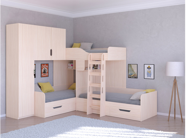 Двухъярусная кровать Трио 1 — продуманная конструкция, которая удобно организует пространство в детской комнате. У каждого ребенка будет полноценная зона для сна, а для игрушек и одежды найдется место в ящиках, на полках и в высоком шкафу. Благодаря угловому расположению и дополнительному ярусу кровать экономит площадь, оставляя больше пространства для игр.