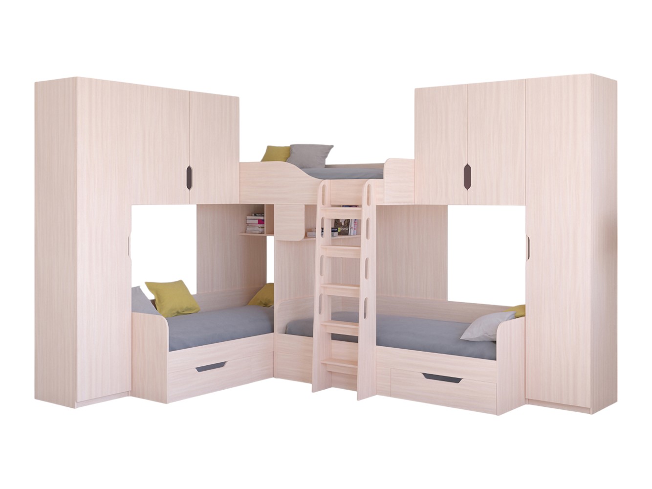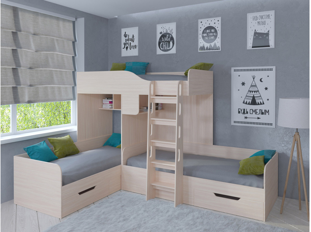 С помощью двухъярусной кровати Трио 3 можно организовать удобное место для сна с продуманной системой хранения для каждого ребенка. Двухъярусная конструкция позволяет комфортно расположить всё необходимое при минимальных затратах площади. Выдвижные ящики, большие шкафы и навесные полки помогут поддерживать порядок в детских вещах.