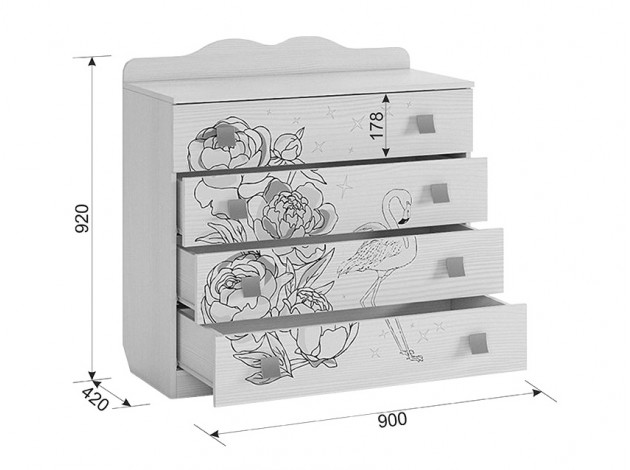 Комод выполнен из ЛДСП 16 мм, края обработаны кромкой ПВХ 0,4 мм. Рисунок на фасадах устойчив к истиранию и ультрафиолету.