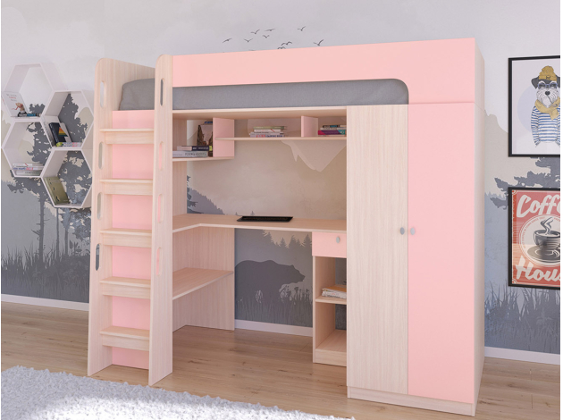 Кровать-чердак Астра 10 — настоящий помощник в организации системы хранения повседневных мелочей и одежды, обустройстве рабочей зоны и спального места.