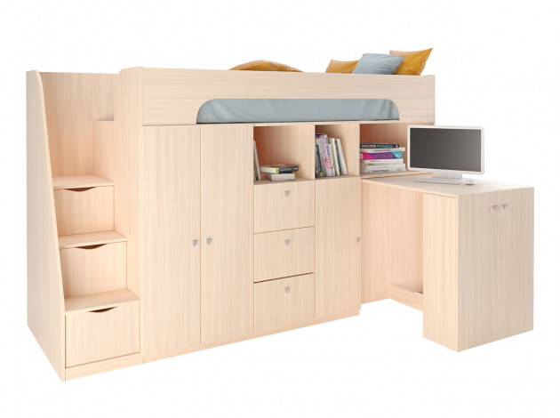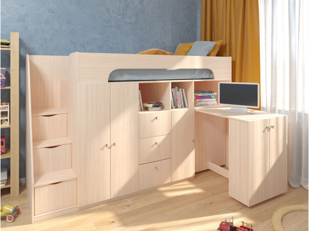 Кровать-чердак Астра 11 удачно дополнит интерьер любой детской комнаты. Продуманная система хранения позволит ребенку разложить свои вещи по местам, а выкатной столик создаст рабочую зону для занятий и учебы.